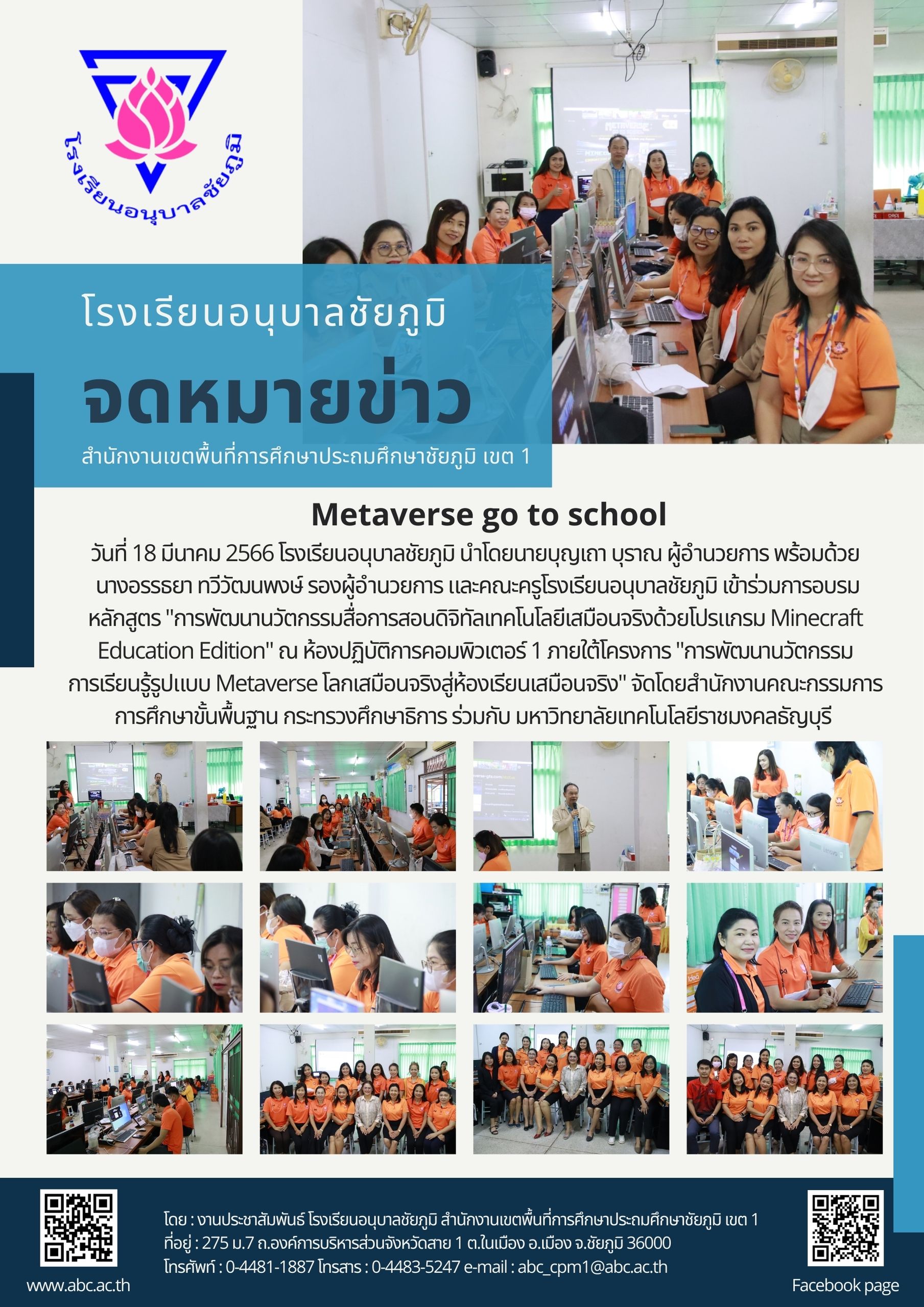 วันที่ 18 มีนาคม 2566 โรงเรียนอนุบาลชัยภูมิ นำโดยนายบุญเถา บุราณ ผู้อำนวยการ พร้อมด้วยนางอรรธยา ทวีวัฒนพงษ์ รองผู้อำนวยการ และคณะครูโรงเรียนอนุบาลชัยภูมิ เข้าร่วมการอบรมหลักสูตร “การพัฒนานวัตกรรมสื่อการสอนดิจิทัลเทคโนโลยีเสมือนจริงด้วยโปรแกรม Minecraft Education Edition” ณ ห้องปฏิบัติการคอมพิวเตอร์ 1 ภายใต้โครงการ “การพัฒนานวัตกรรมการเรียนรู้รูปแบบ Metaverse โลกเสมือนจริงสู่ห้องเรียนเสมือนจริง” จัดโดยสำนักงานคณะกรรมการการศึกษาขั้นพื้นฐาน กระทรวงศึกษาธิการ ร่วมกับ มหาวิทยาลัยเทคโนโลยีราชมงคลธัญบุรี