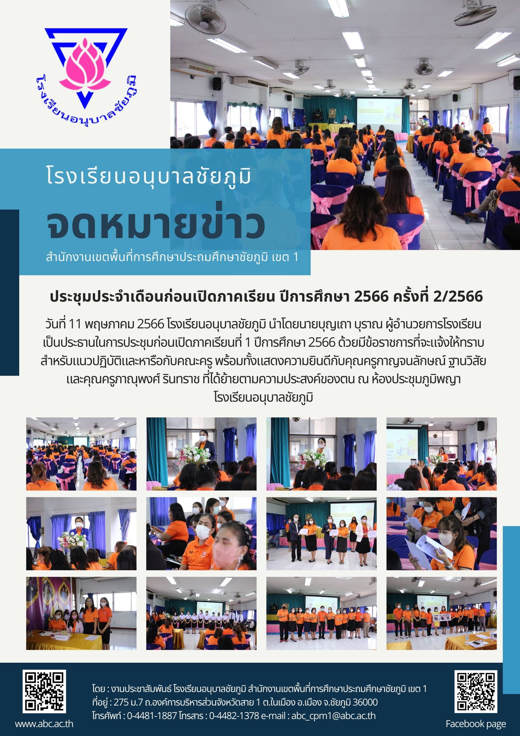 วันที่ 11 พฤษภาคม 2566 โรงเรียนอนุบาลชัยภูมิ นำโดยนายบุญเถา บุราณ ผู้อำนวยการโรงเรียน เป็นประธานในการประชุม ก่อนเปิดภาคเรียนที่ 1 ปีการศึกษา 2566 ด้วยมีข้อราชการที่จะแจ้งให้ทราบสำหรับแนวปฏิบัติและหารือกับคณะครู พร้อมทั้งแสดงความยินดีกับคุณครูกาญจนลักษณ์ ฐานวิสัย และคุณครูภาณุพงศ์ รินทราช ที่ได้ย้ายตามความประสงค์ของตน ณ ห้องประชุมภูมิพญา โรงเรียนอนุบาลชัยภูมิ