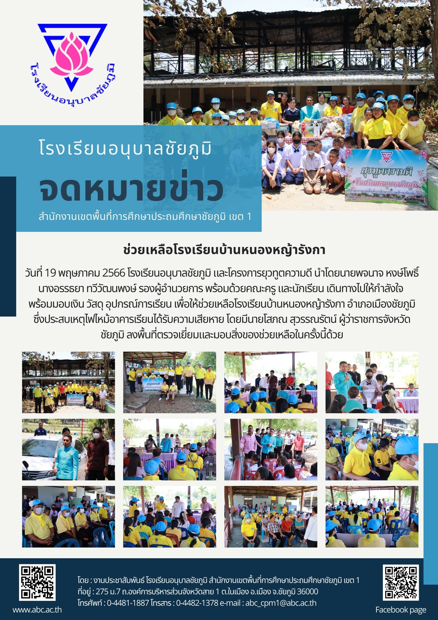วันที่ 19 พฤษภาคม 2566 โรงเรียนอนุบาลชัยภูมิ และโครงการยุวทูตความดี นำโดยนายพจนาจ หงษ์โพธิ์ นางอรรธยา ทวีวัฒนพงษ์ รองผู้อำนวยการ พร้อมด้วยคณะครู และนักเรียน เดินทางไปให้กำลังใจ พร้อมมอบเงิน วัสดุ อุปกรณ์การเรียน เพื่อให้ช่วยเหลือโรงเรียนบ้านหนองหญ้ารังกา อำเภอเมืองชัยภูมิ ซึ่งประสบเหตุไฟไหม้อาคารเรียนได้รับความเสียหาย โดยมีนายโสภณ สุวรรณรัตน์ ผู้ว่าราชการจังหวัดชัยภูมิ ลงพื้นที่ตรวจเยี่ยมและมอบสิ่งของช่วยเหลือในครั้งนี้ด้วย