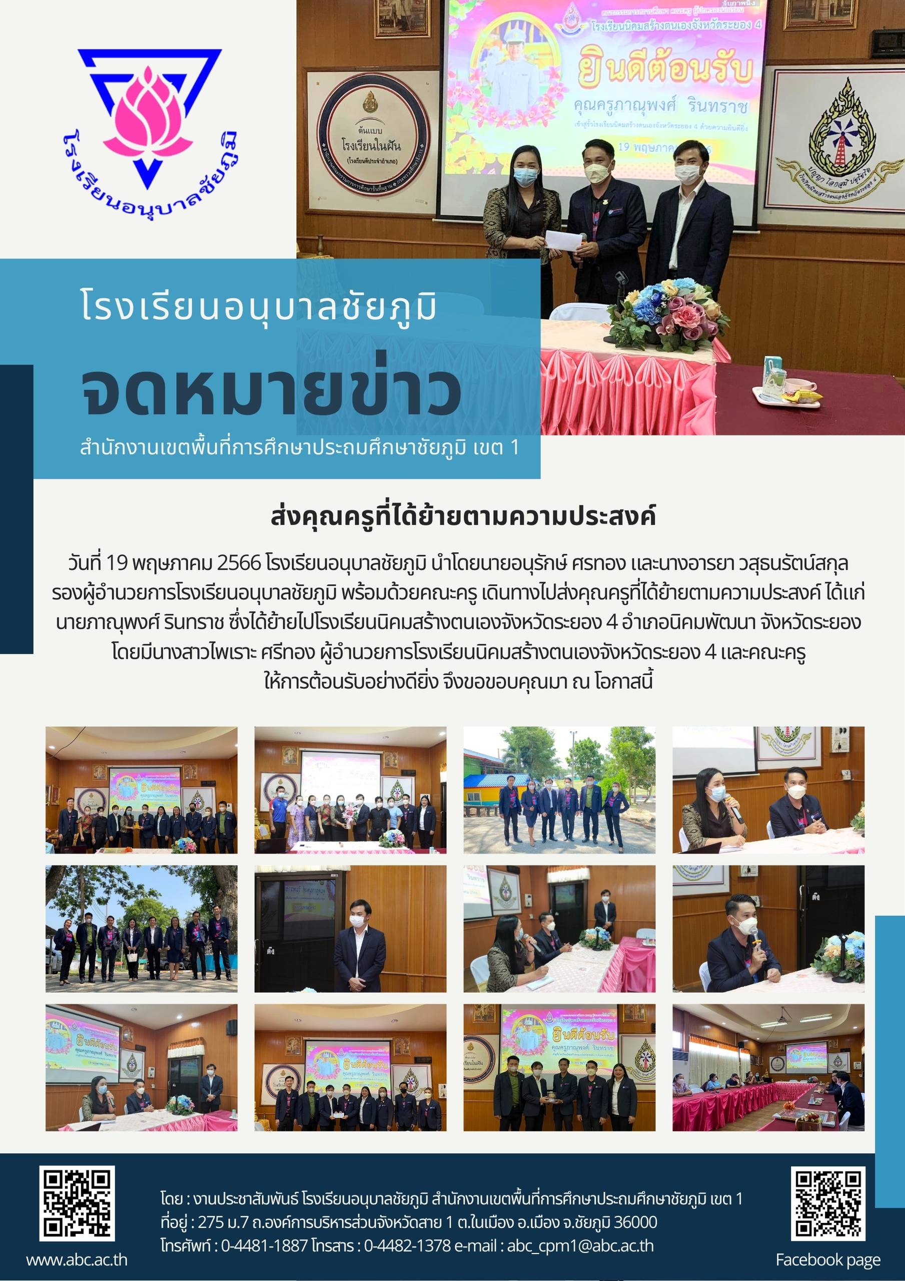 วันที่ 19 พฤษภาคม 2566 โรงเรียนอนุบาลชัยภูมิ นำโดยนายอนุรักษ์ ศรทอง และนางอารยา วสุธนรัตน์สกุล รองผู้อำนวยการโรงเรียนอนุบาลชัยภูมิ พร้อมด้วยคณะครู เดินทางไปส่งคุณครูที่ได้ย้ายตามความประสงค์ ได้แก่ นายภาณุพงศ์ รินทราช ซึ่งได้ย้ายไปโรงเรียนนิคมสร้างตนเองจังหวัดระยอง 4 อำเภอนิคมพัฒนา จังหวัดระยอง โดยมีนางสาวไพเราะ ศรีทอง ผู้อำนวยการโรงเรียนนิคมสร้างตนเองจังหวัดระยอง 4 และคณะครูให้การต้อนรับอย่างดียิ่ง จึงขอขอบคุณมา ณ โอกาสนี้