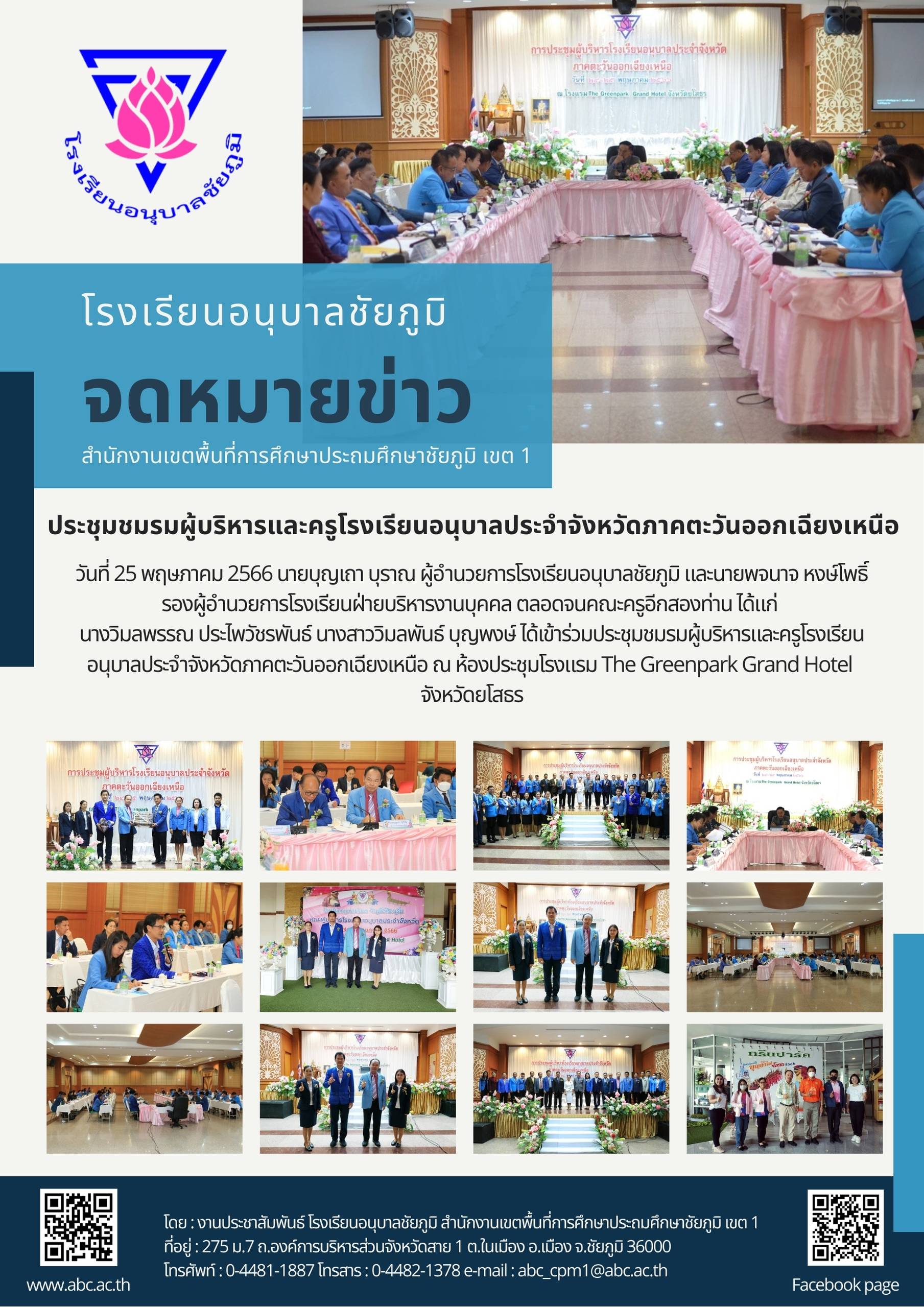 วันที่ 25 พฤษภาคม 2566 นายบุญเถา บุราณ ผู้อำนวยการโรงเรียนอนุบาลชัยภูมิ และนายพจนาจ หงษ์โพธิ์ รองผู้อำนวยการโรงเรียนฝ่ายบริหารงานบุคคล ตลอดจนคณะครูอีกสองท่าน ได้แก่ นางวิมลพรรณ ประไพวัชรพันธ์ นางสาววิมลพันธ์ บุญพงษ์ ได้เข้าร่วมประชุมชมรมผู้บริหารและครูโรงเรียนอนุบาลประจำจังหวัดภาคตะวันออกเฉียงเหนือ ณ ห้องประชุมโรงแรม The Greenpark Grand Hotel จังหวัดยโสธร