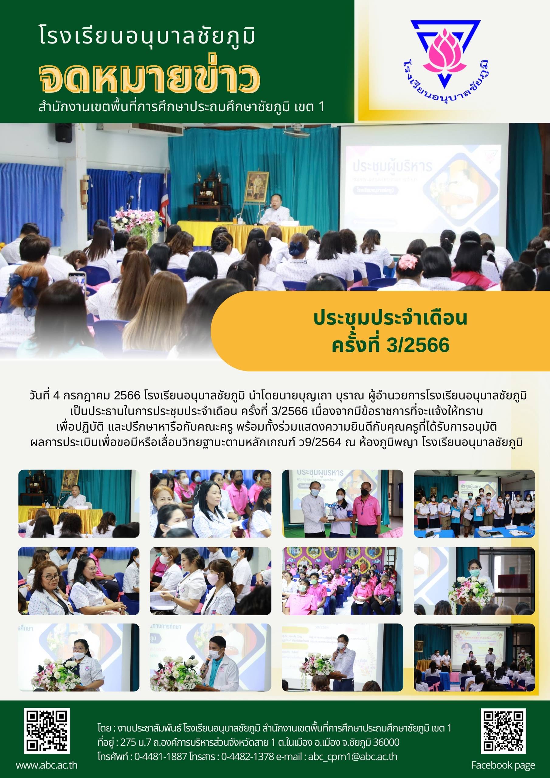 วันที่ 4 กรกฎาคม 2566 โรงเรียนอนุบาลชัยภูมิ นำโดยนายบุญเถา บุราณ ผู้อำนวยการโรงเรียนอนุบาลชัยภูมิ เป็นประธานในการประชุมประจำเดือน ครั้งที่ 3/2566 เนื่องจากมีข้อราชการที่จะแจ้งให้ทราบเพื่อปฏิบัติ และปรึกษาหารือกับคณะครู พร้อมทั้งร่วมแสดงความยินดีกับคุณครูที่ได้รับการอนุมัติผลการประเมินเพื่อขอมีหรือเลื่อนวิทยฐานะตามหลักเกณฑ์ ว9/2564 ณ ห้องภูมิพญา โรงเรียนอนุบาลชัยภูมิ