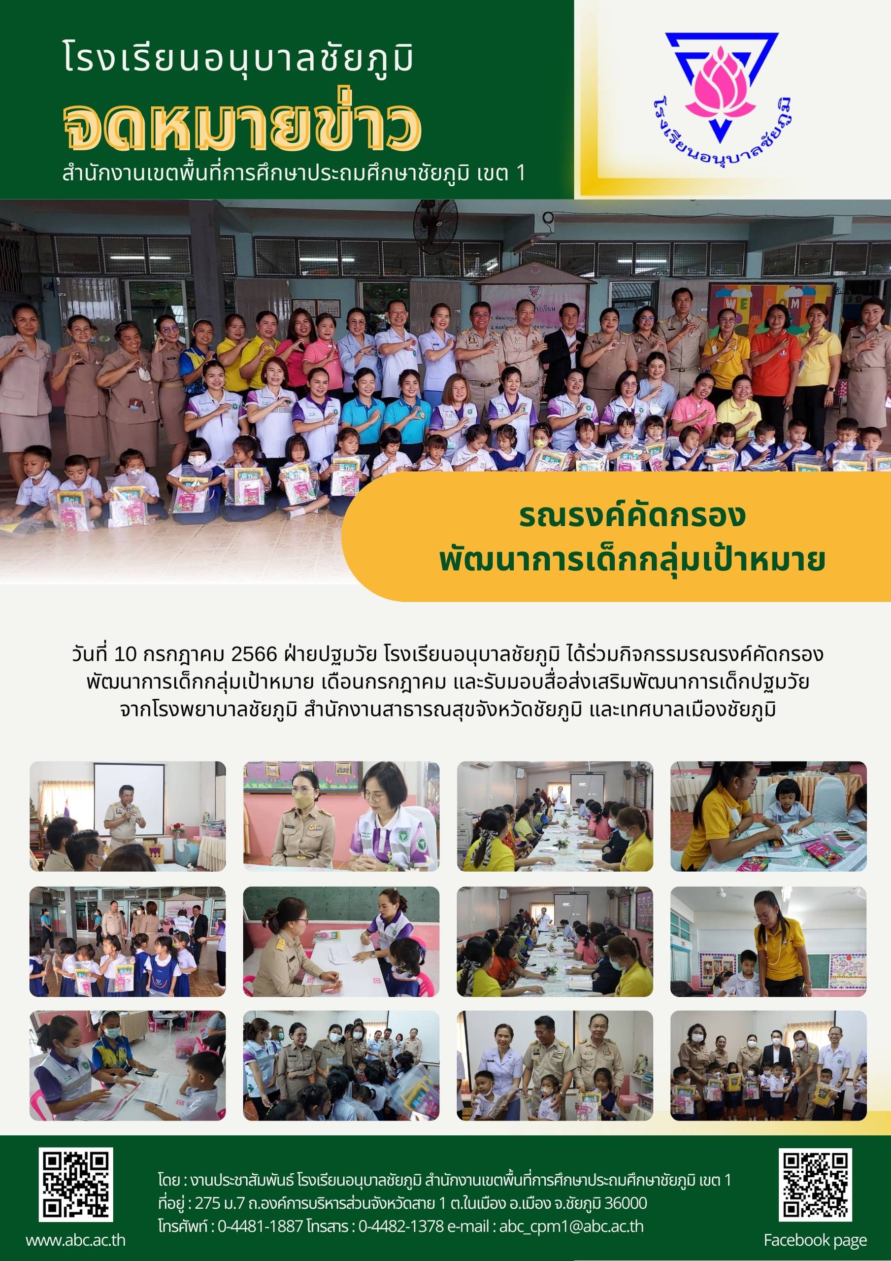 จดหมายข่าว จดหมายข่าว วันที่ 10 กรกฎาคม 2566 By Admin 13/07/2023 0 Comments Less than a minute 360 Views 3 ปี ago วันที่ 10 กรกฎาคม 2566 ฝ่ายปฐมวัย โรงเรียนอนุบาลชัยภูมิ ได้ร่วมกิจกรรมรณรงค์คัดกรองพัฒนาการเด็กกลุ่มเป้าหมาย เดือนกรกฎาคม และรับมอบสื่อส่งเสริมพัฒนาการเด็กปฐมวัย จากโรงพยาบาลชัยภูมิ สำนักงานสาธารณสุขจังหวัดชัยภูมิ และเทศบาลเมืองชัยภูมิ FacebookfacebookXtwitterLINEline