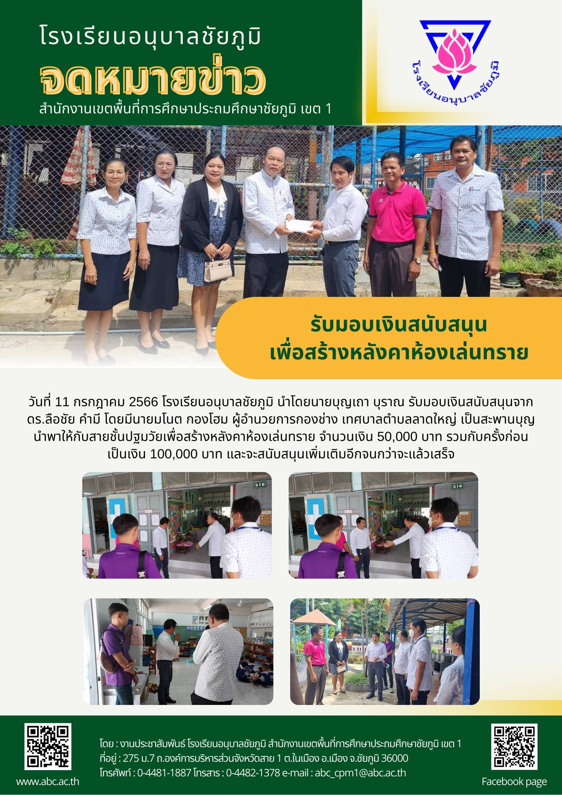 วันที่ 11 กรกฎาคม 2566 โรงเรียนอนุบาลชัยภูมิ นำโดยนายบุญเถา บุราณ รับมอบเงินสนับสนุนจาก ดร.ลือชัย คำมี โดยมีนายมโนต กองโฮม ผู้อำนวยการกองช่าง เทศบาลตำบลลาดใหญ่ เป็นสะพานบุญนำพาให้กับสายชั้นปฐมวัยเพื่อสร้างหลังคาห้องเล่นทราย จำนวนเงิน 50,000 บาท รวมกับครั้งก่อนเป็นเงิน 100,000 บาท และจะสนับสนุนเพิ่มเติมอีกจนกว่าจะแล้วเสร็จ
