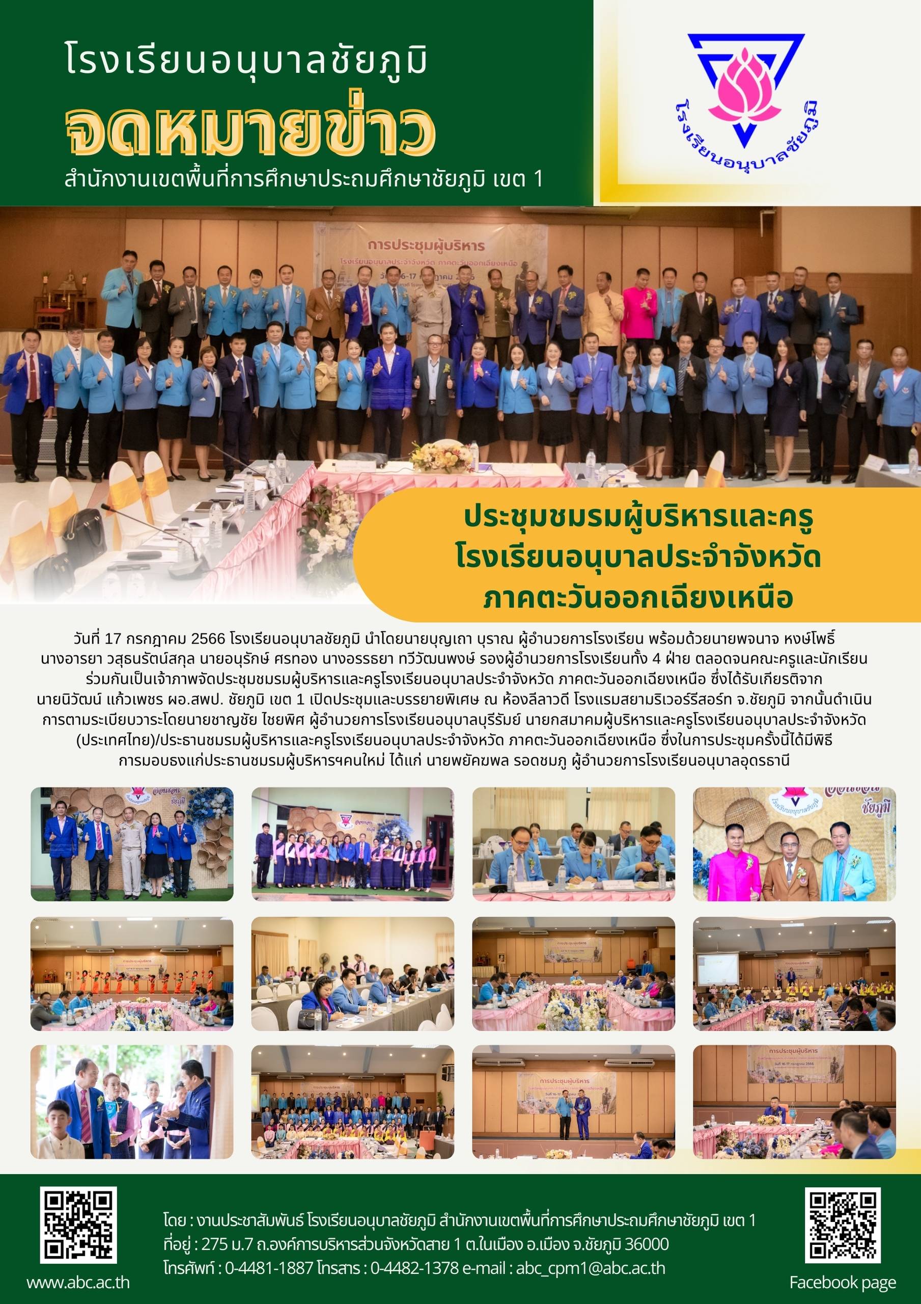 วันที่ 17 กรกฎาคม 2566 โรงเรียนอนุบาลชัยภูมิ นำโดยนายบุญเถา บุราณ ผู้อำนวยการโรงเรียน พร้อมด้วยนายพจนาจ หงษ์โพธิ์ นางอารยา วสุธนรัตน์สกุล นายอนุรักษ์ ศรทอง นางอรรธยา ทวีวัฒนพงษ์ รองผู้อำนวยการโรงเรียนทั้ง 4 ฝ่าย ตลอดจนคณะครูและนักเรียน ร่วมกันเป็นเจ้าภาพจัดประชุมชมรมผู้บริหารและครูโรงเรียนอนุบาลประจำจังหวัด ภาคตะวันออกเฉียงเหนือ ซึ่งได้รับเกียรติจากนายนิวัฒน์ แก้วเพชร ผอ.สพป. ชัยภูมิ เขต 1 เปิดประชุมและบรรยายพิเศษ ณ ห้องลีลาวดี โรงแรมสยามริเวอร์รีสอร์ท จ.ชัยภูมิ จากนั้นดำเนินการตามระเบียบวาระโดยนายชาญชัย ไชยพิศ ผู้อำนวยการโรงเรียนอนุบาลบุรีรัมย์ นายกสมาคมผู้บริหารและครูโรงเรียนอนุบาลประจำจังหวัด (ประเทศไทย)/ประธานชมรมผู้บริหารและครูโรงเรียนอนุบาลประจำจังหวัด ภาคตะวันออกเฉียงเหนือ ซึ่งในการประชุมครั้งนี้ได้มีพิธีการมอบธงแก่ประธานชมรมผู้บริหารฯคนใหม่ ได้แก่ นายพยัคฆพล รอดชมภู ผู้อำนวยการโรงเรียนอนุบาลอุดรธานี