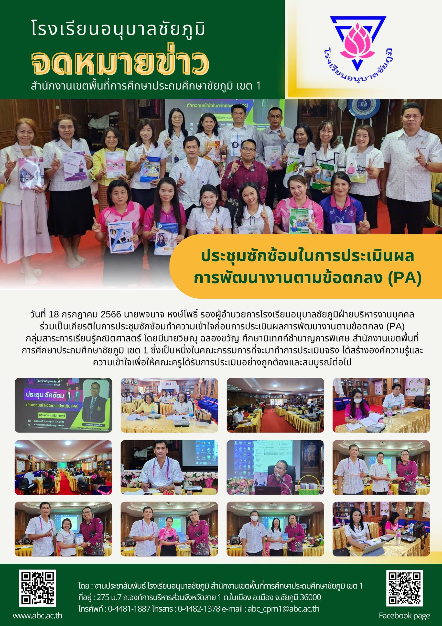 วันที่ 18 กรกฎาคม 2566 นายพจนาจ หงษ์โพธิ์ รองผู้อำนวยการโรงเรียนอนุบาลชัยภูมิฝ่ายบริหารงานบุคคลร่วมเป็นเกียรติในการประชุมซักซ้อมทำความเข้าใจก่อนการประเมินผลการพัฒนางานตามข้อตกลง (PA) กลุ่มสาระการเรียนรู้คณิตศาสตร์ โดยมีนายวิษณุ ฉลองขวัญ ศึกษานิเทศก์ชำนาญการพิเศษ สำนักงานเขตพื้นที่การศึกษาประถมศึกษาชัยภูมิ เขต 1 ซึ่งเป็นหนึ่งในคณะกรรมการที่จะมาทำการประเมินจริง ได้สร้างองค์ความรู้และความเข้าใจเพื่อให้คณะครูได้รับการประเมินอย่างถูกต้องและสมบูรณ์ต่อไป