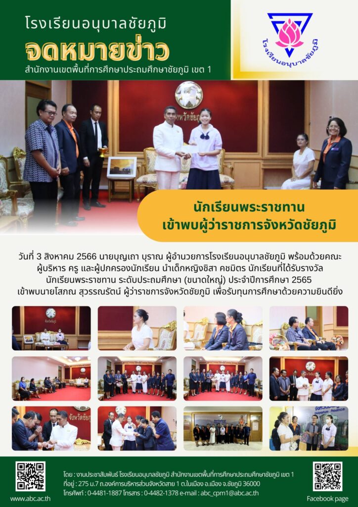 วันที่ 3 สิงหาคม 2566 นายบุญเถา บุราณ ผู้อำนวยการโรงเรียนอนุบาลชัยภูมิ พร้อมด้วยคณะผู้บริหาร ครู และผู้ปกครองนักเรียน นำเด็กหญิงชิสา คชมิตร นักเรียนที่ได้รับรางวัลนักเรียนพระราชทาน ระดับประถมศึกษา (ขนาดใหญ่) ประจำปีการศึกษา 2565 เข้าพบนายโสภณ สุวรรณรัตน์ ผู้ว่าราชการจังหวัดชัยภูมิ เพื่อรับทุนการศึกษาด้วยความยินดียิ่ง