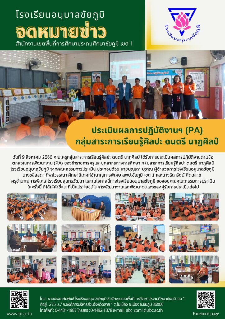 วันที่ 9 สิงหาคม 2566 คณะครูกลุ่มสาระการเรียนรู้ศิลปะ ดนตรี นาฏศิลป์ ได้รับการประเมินผลการปฏิบัติงานตามข้อตกลงในการพัฒนางาน (PA) ของข้าราชการครูและบุคลากรทางการศึกษา กลุ่มสาระการเรียนรู้ศิลปะ ดนตรี นาฏศิลป์ โรงเรียนอนุบาลชัยภูมิ จากคณะกรรมการประเมิน ประกอบด้วย นายบุญเถา บุราณ ผู้อำนวยการโรงเรียนอนุบาลชัยภูมิ นางชลิลลดา ทิพย์วรรณา ศึกษานิเทศก์ชำนาญการพิเศษ สพป.ชัยภูมิ เขต 1 และนางธิดารัตน์ คิดฉลาด ครูชำนาญการพิเศษ โรงเรียนสุนทรวัฒนา และในโอกาสนี้ทางโรงเรียนอนุบาลชัยภูมิ ขอขอบคุณคณะกรรมการประเมินในครั้งนี้ ที่ได้ให้คำชี้แนะที่เป็นประโยชน์ในการพัฒนางานและพัฒนาตนเองของผู้รับการประเมินต่อไป