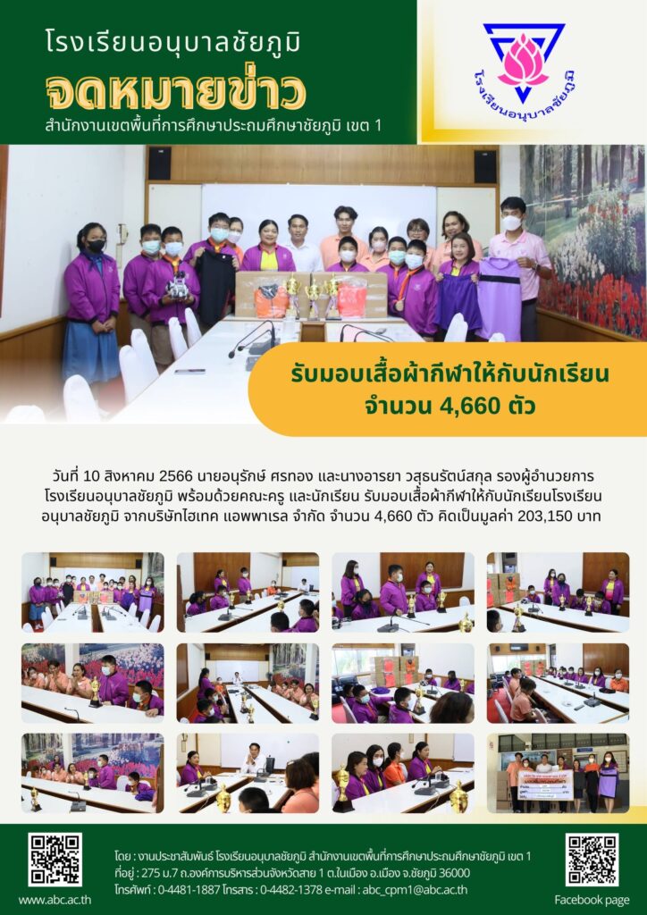 วันที่ 10 สิงหาคม 2566 นายอนุรักษ์ ศรทอง และนางอารยา วสุธนรัตน์สกุล รองผู้อำนวยการโรงเรียนอนุบาลชัยภูมิ พร้อมด้วยคณะครู และนักเรียน รับมอบเสื้อผ้ากีฬาให้กับนักเรียนโรงเรียนอนุบาลชัยภูมิ จากบริษัทไฮเทค แอพพาเรล จำกัด จำนวน 4,660 ตัว คิดเป็นมูลค่า 203,150 บาท