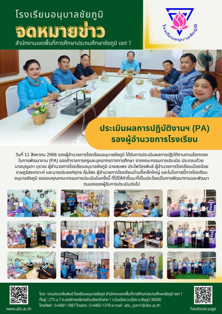 วันที่ 11 สิงหาคม 2566 รองผู้อำนวยการโรงเรียนอนุบาลชัยภูมิ ได้รับการประเมินผลการปฏิบัติงานตามข้อตกลงในการพัฒนางาน (PA) ของข้าราชการครูและบุคลากรทางการศึกษา จากคณะกรรมการประเมิน ประกอบด้วย นายบุญเถา บุราณ ผู้อำนวยการโรงเรียนอนุบาลชัยภูมิ นายสมพร ประไพวัชรพันธ์ ผู้อำนวยการโรงเรียนเมืองน้อยราษฎร์สงเคราะห์ และนายประยงค์ยุทธ คุ้มไพร ผู้อำนวยการโรงเรียนบ้านขี้เหล็กใหญ่ และในโอกาสนี้ทางโรงเรียนอนุบาลชัยภูมิ ขอขอบคุณคณะกรรมการประเมินในครั้งนี้ ที่ได้ให้คำชี้แนะที่เป็นประโยชน์ในการพัฒนางานและพัฒนาตนเองของผู้รับการประเมินต่อไป