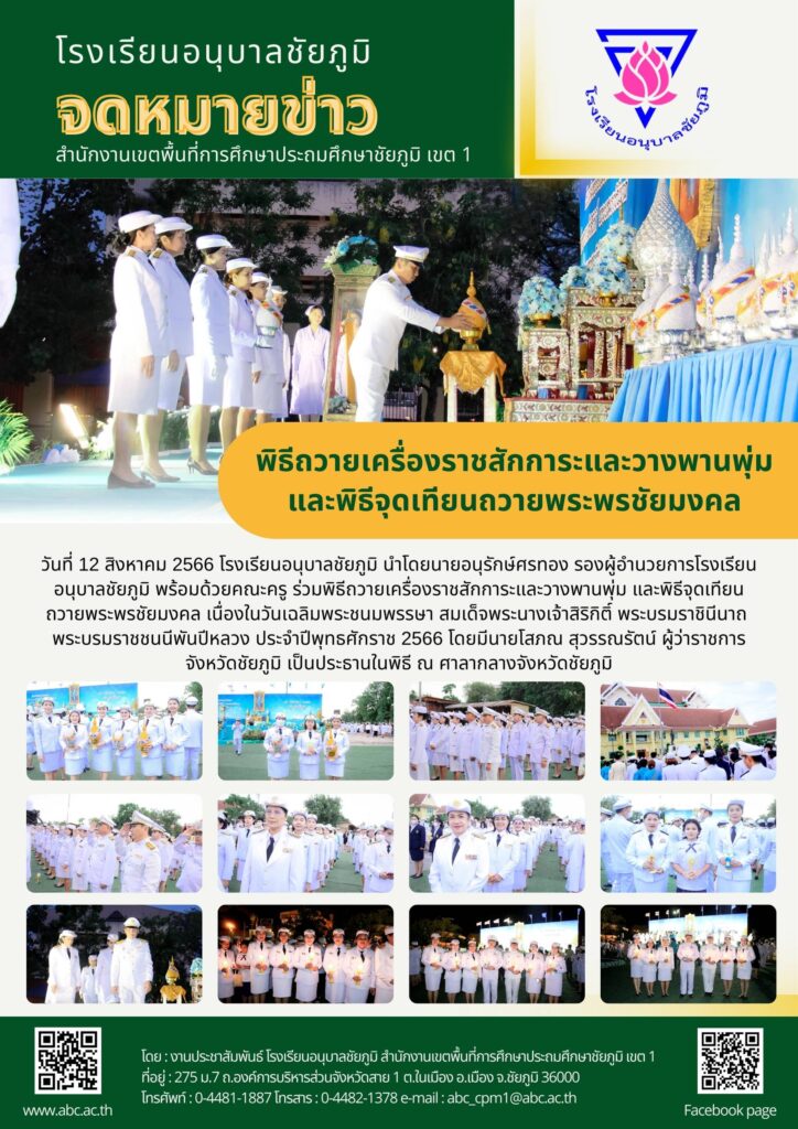 วันที่ 12 สิงหาคม 2566 โรงเรียนอนุบาลชัยภูมิ นำโดยนายอนุรักษ์ศรทอง รองผู้อำนวยการโรงเรียนอนุบาลชัยภูมิ พร้อมด้วยคณะครู ร่วมพิธีถวายเครื่องราชสักการะและวางพานพุ่ม และพิธีจุดเทียนถวายพระพรชัยมงคล เนื่องในวันเฉลิมพระชนมพรรษา สมเด็จพระนางเจ้าสิริกิติ์ พระบรมราชินีนาถ พระบรมราชชนนีพันปีหลวง ประจำปีพุทธศักราช 2566 โดยมีนายโสภณ สุวรรณรัตน์ ผู้ว่าราชการจังหวัดชัยภูมิ เป็นประธานในพิธี ณ ศาลากลางจังหวัดชัยภูมิ