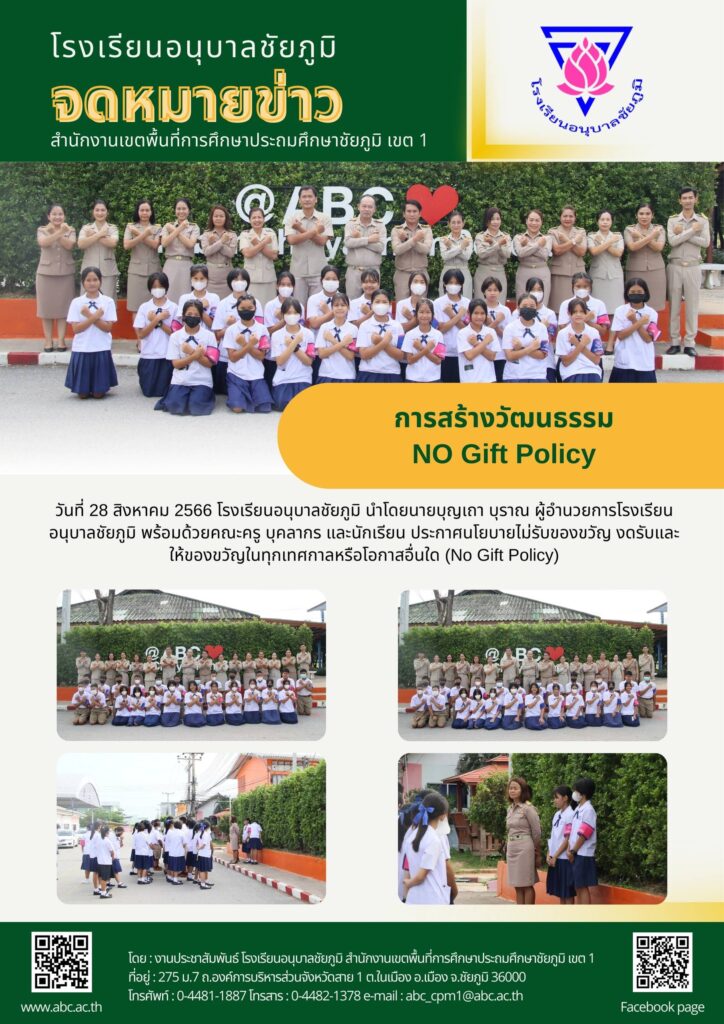 วันที่ 28 สิงหาคม 2566 โรงเรียนอนุบาลชัยภูมิ นำโดยนายบุญเถา บุราณ ผู้อำนวยการโรงเรียน อนุบาลชัยภูมิ พร้อมด้วยคณะครู บุคลากร และนักเรียน ประกาศนโยบายไม่รับของขวัญ งดรับและ ให้ของขวัญในทุกเทศกาลหรือโอกาสอื่นใด (No Gift Policy)