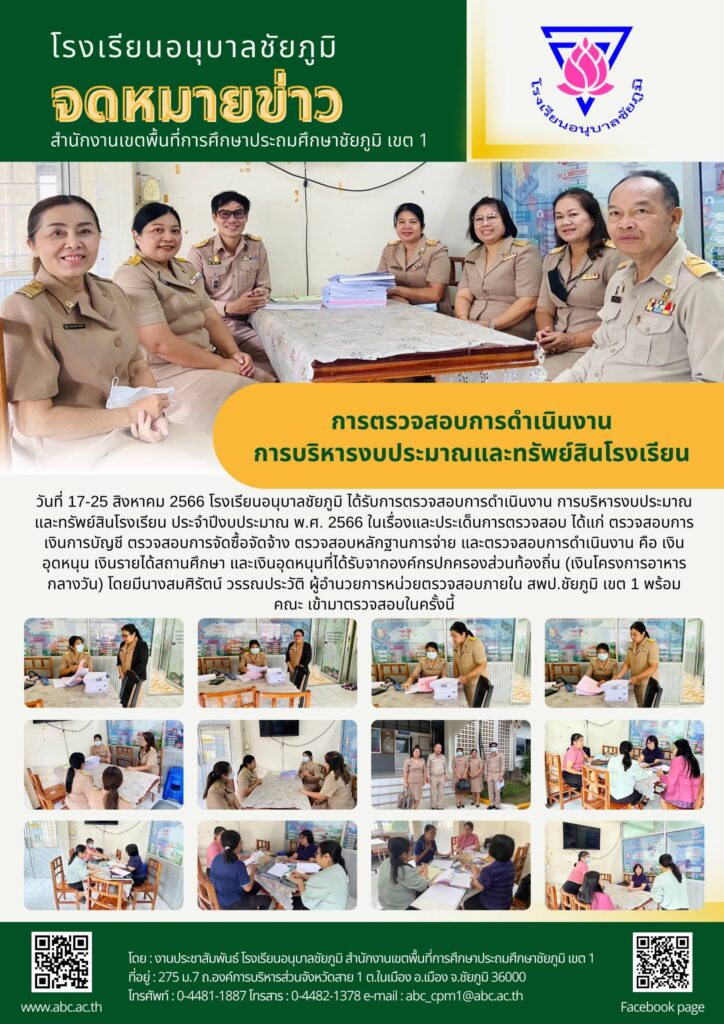 วันที่ 17-25 สิงหาคม 2566 โรงเรียนอนุบาลชัยภูมิ ได้รับการตรวจสอบการดำเนินงาน การบริหารงบประมาณ และทรัพย์สินโรงเรียน ประจำปีงบประมาณ พ.ศ. 2566 ในเรื่องและประเด็นการตรวจสอบ ได้แก่ ตรวจสอบการเงินการบัญชี ตรวจสอบการจัดซื้อจัดจ้าง ตรวจสอบหลักฐานการจ่าย และตรวจสอบการดำเนินงาน คือ เงินอุดหนุน เงินรายได้สถานศึกษา และเงินอุดหนุนที่ได้รับจากองค์กรปกครองส่วนท้องถิ่น (เงินโครงการอาหารกลางวัน) โดยมีนางสมศิรัตน์ วรรณประวัติ ผู้อำนวยการหน่วยตรวจสอบภายใน สพป.ชัยภูมิ เขต 1 พร้อมคณะ เข้ามาตรวจสอบในครั้งนี้
