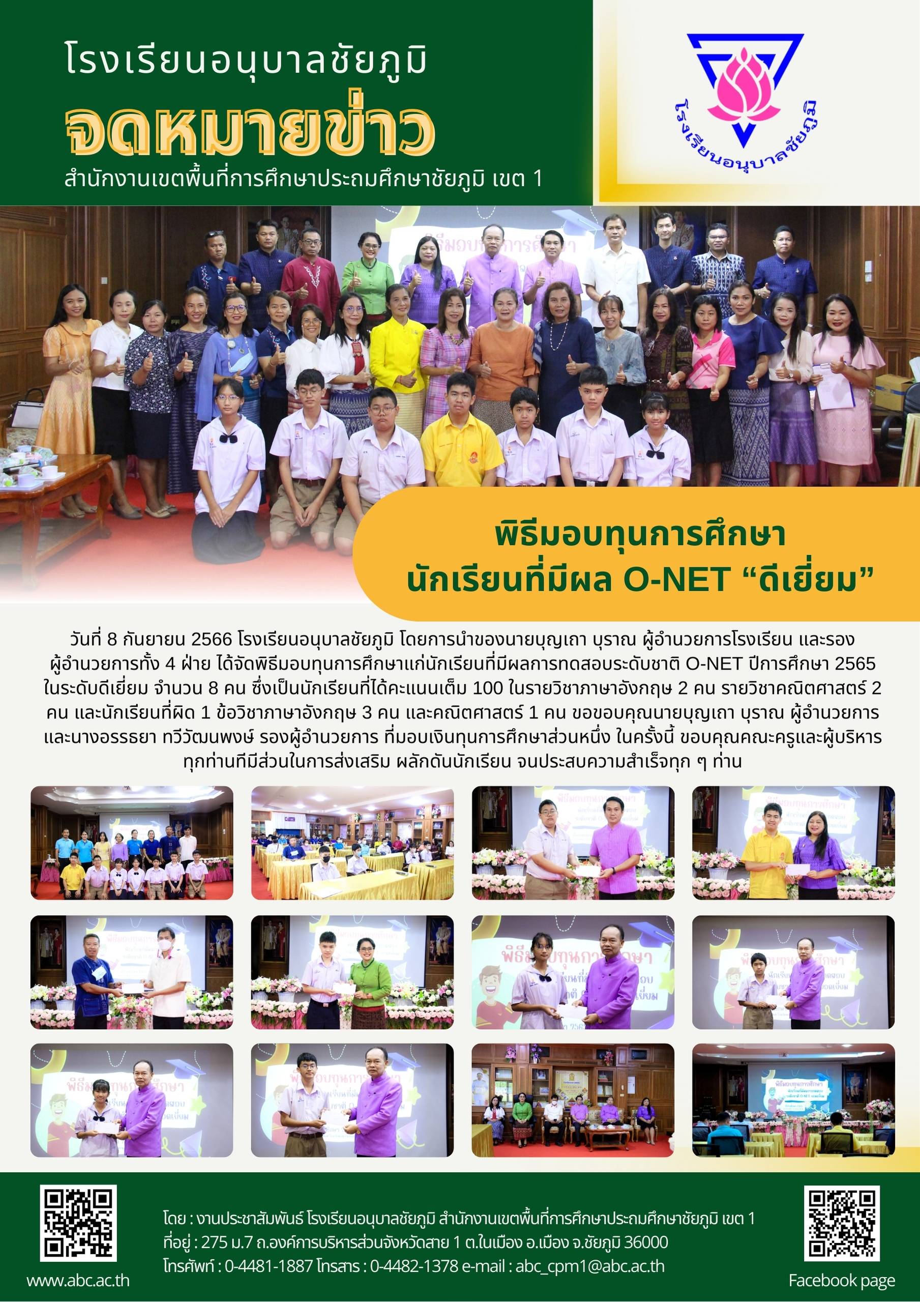 วันที่ 8 กันยายน 2566 โรงเรียนอนุบาลชัยภูมิ โดยการนำของนายบุญเถา บุราณ ผู้อำนวยการโรงเรียน และรองผู้อำนวยการทั้ง 4 ฝ่าย ได้จัดพิธีมอบทุนการศึกษาแก่นักเรียนที่มีผลการทดสอบระดับชาติ O-NET ปีการศึกษา 2565 ในระดับดีเยี่ยม จำนวน 8 คน ซึ่งเป็นนักเรียนที่ได้คะแนนเต็ม 100 ในรายวิชาภาษาอังกฤษ 2 คน รายวิชาคณิตศาสตร์ 2 คน และนักเรียนที่ผิด 1 ข้อวิชาภาษาอังกฤษ 3 คน และคณิตศาสตร์ 1 คน ขอขอบคุณนายบุญเถา บุราณ ผู้อำนวยการ และนางอรรธยา ทวีวัฒนพงษ์ รองผู้อำนวยการ ที่มอบเงินทุนการศึกษาส่วนหนึ่ง ในครั้งนี้ ขอบคุณคณะครูและผู้บริหารทุกท่านทีมีส่วนในการส่งเสริม ผลักดันนักเรียน จนประสบความสำเร็จทุก ๆ ท่าน
