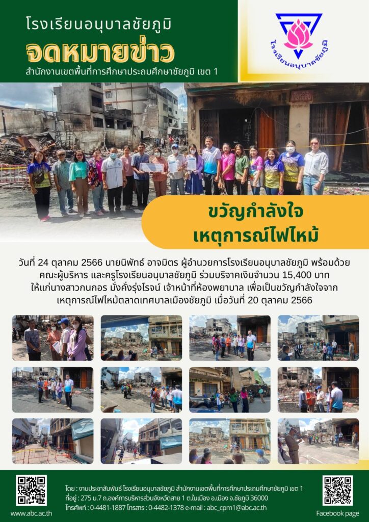 วันที่ 24 ตุลาคม 2566 นายนิพัทธ์ อาจมิตร ผู้อำนวยการโรงเรียนอนุบาลชัยภูมิ พร้อมด้วยคณะผู้บริหาร และครูโรงเรียนอนุบาลชัยภูมิ ร่วมบริจาคเงินจำนวน 15,400 บาท ให้แก่นางสาวกนกอร มั่งคั่งรุ่งโรจน์ เจ้าหน้าที่ห้องพยาบาล เพื่อเป็นขวัญกำลังใจจากเหตุการณ์ไฟไหม้ตลาดเทศบาลเมืองชัยภูมิ เมื่อวันที่ 20 ตุลาคม 2566