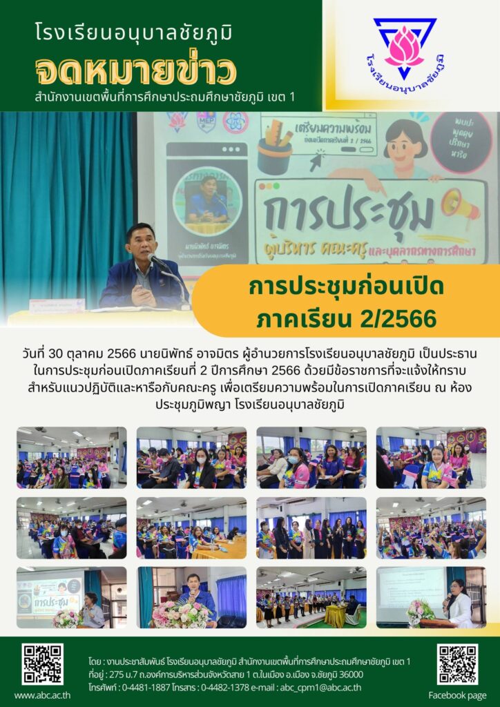 วันที่ 30 ตุลาคม 2566 นายนิพัทธ์ อาจมิตร ผู้อำนวยการโรงเรียนอนุบาลชัยภูมิ เป็นประธานในการประชุมก่อนเปิดภาคเรียนที่ 2 ปีการศึกษา 2566 ด้วยมีข้อราชการที่จะแจ้งให้ทราบ สำหรับแนวปฏิบัติและหารือกับคณะครู เพื่อเตรียมความพร้อมในการเปิดภาคเรียน ณ ห้องประชุมภูมิพญา โรงเรียนอนุบาลชัยภูมิ
