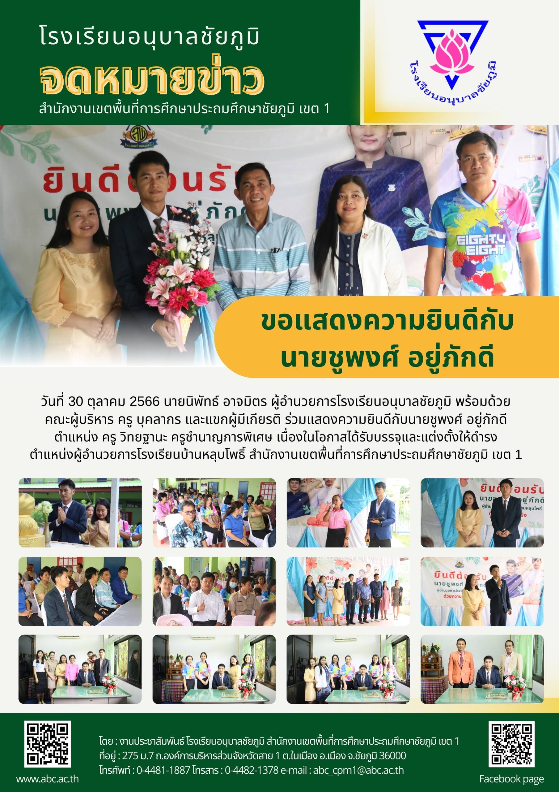 วันที่ 30 ตุลาคม 2566 นายนิพัทธ์ อาจมิตร ผู้อำนวยการโรงเรียนอนุบาลชัยภูมิ พร้อมด้วยคณะผู้บริหาร ครู บุคลากร และแขกผู้มีเกียรติ ร่วมแสดงความยินดีกับนายชูพงศ์ อยู่ภักดี ตำแหน่ง ครู วิทยฐานะ ครูชำนาญการพิเศษ เนื่องในโอกาสได้รับบรรจุและแต่งตั้งให้ดำรงตำแหน่งผู้อำนวยการโรงเรียนบ้านหลุบโพธิ์ สำนักงานเขตพื้นที่การศึกษาประถมศึกษาชัยภูมิ เขต 1