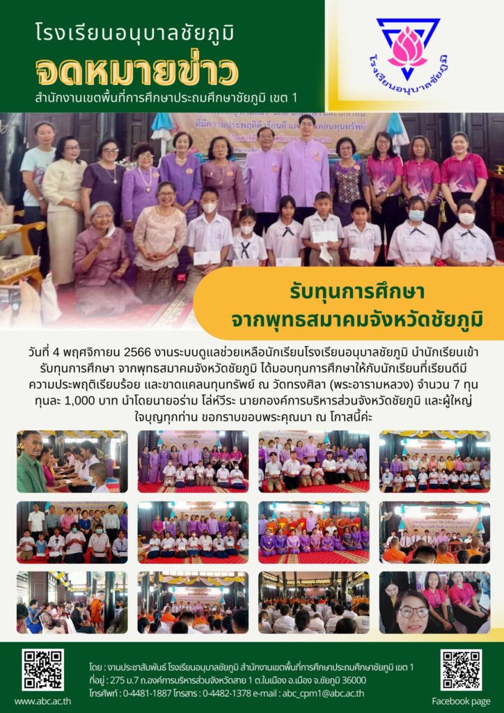 วันที่ 4 พฤศจิกายน 2566 งานระบบดูแลช่วยเหลือนักเรียนโรงเรียนอนุบาลชัยภูมิ นำนักเรียนเข้ารับทุนการศึกษา จากพุทธสมาคมจังหวัดชัยภูมิ ได้มอบทุนการศึกษาให้กับนักเรียนที่เรียนดีมีความประพฤติเรียบร้อย และขาดแคลนทุนทรัพย์ ณ วัดทรงศิลา (พระอารามหลวง) จำนวน 7 ทุน ทุนละ 1,000 บาท นำโดยนายอร่าม โล่ห์วีระ นายกองค์การบริหารส่วนจังหวัดชัยภูมิ และผู้ใหญ่ใจบุญทุกท่าน ขอกราบขอบพระคุณมา ณ โกาสนี้ค่ะ