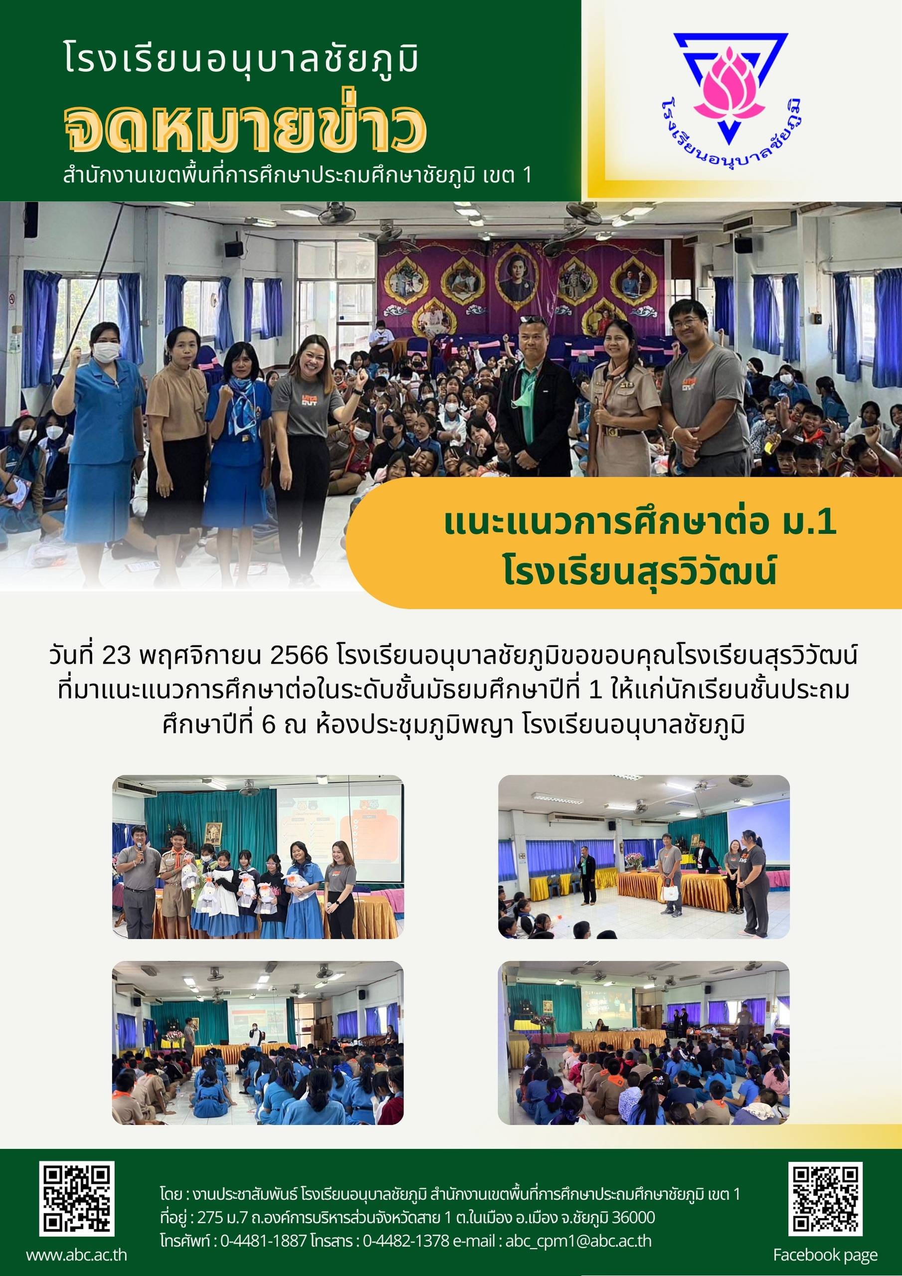 จดหมายข่าว จดหมายข่าววันที่ 23 พฤศจิกายน 2566 By Admin 15/12/2023 0 Comments Less than a minute 182 Views 2 ปี ago วันที่ 23 พฤศจิกายน 2566 โรงเรียนอนุบาลชัยภูมิขอขอบคุณโรงเรียนสุรวิวัฒน์ที่มาแนะแนวการศึกษาต่อในระดับชั้นมัธยมศึกษาปีที่ 1 ให้แก่นักเรียนชั้นประถมศึกษาปีที่ 6 ณ ห้องประชุมภูมิพญา โรงเรียนอนุบาลชัยภูมิ FacebookfacebookXtwitterLINEline