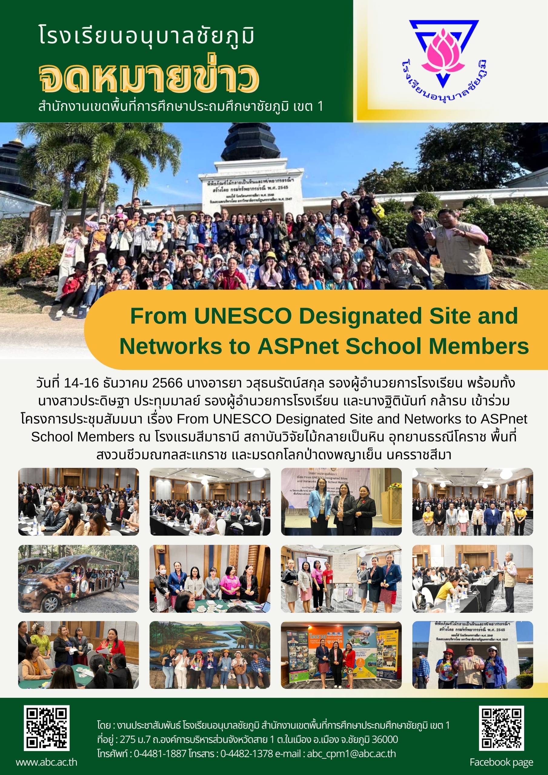 วันที่ 14-16 ธันวาคม 2566 นางอารยา วสุธนรัตน์สกุล รองผู้อำนวยการโรงเรียน พร้อมทั้งนางสาวประดิษฐา ประทุมมาลย์ รองผู้อำนวยการโรงเรียน และนางฐิตินันท์ กล้ารบ เข้าร่วมโครงการประชุมสัมมนา เรื่อง From UNESCO Designated Site and Networks to ASPnet School Members ณ โรงแรมสีมาธานี สถาบันวิจัยไม้กลายเป็นหิน อุทยานธรณีโคราช พื้นที่สงวนชีวมณฑลสะแกราช และมรดกโลกป่าดงพญาเย็น นครราชสีมา