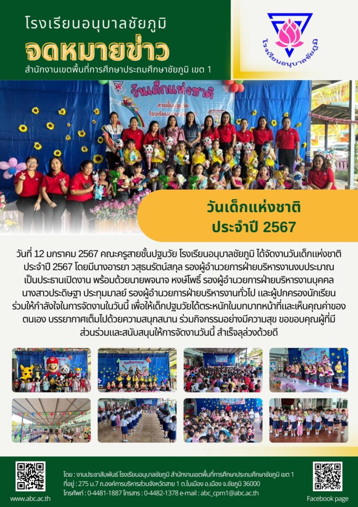 วันที่ 12 มกราคม 2567 คณะครูสายชั้นปฐมวัย โรงเรียนอนุบาลชัยภูมิ ได้จัดงานวันเด็กแห่งชาติ ประจำปี 2567 โดยมีนางอารยา วสุธนรัตน์สกุล รองผู้อำนวยการฝ่ายบริหารงานงบประมาณ เป็นประธานเปิดงาน พร้อมด้วยนายพจนาจ หงษ์โพธิ์ รองผู้อำนวยการฝ่ายบริหารงานบุคคล นางสาวประดิษฐา ประทุมมาลย์ รองผู้อำนวยการฝ่ายบริหารงานทั่วไป และผู้ปกครองนักเรียน ร่วมให้กำลังใจในการจัดงานในวันนี้ เพื่อให้เด็กปฐมวัยได้ตระหนักในบทบาทหน้าที่และเห็นคุณค่าของตนเอง บรรยากาศเต็มไปด้วยความสนุกสนาน ร่วมกิจกรรมอย่างมีความสุข ขอขอบคุณผู้ที่มีส่วนร่วมและสนับสนุนให้การจัดงานวันนี้ สำเร็จลุล่วงด้วยดี