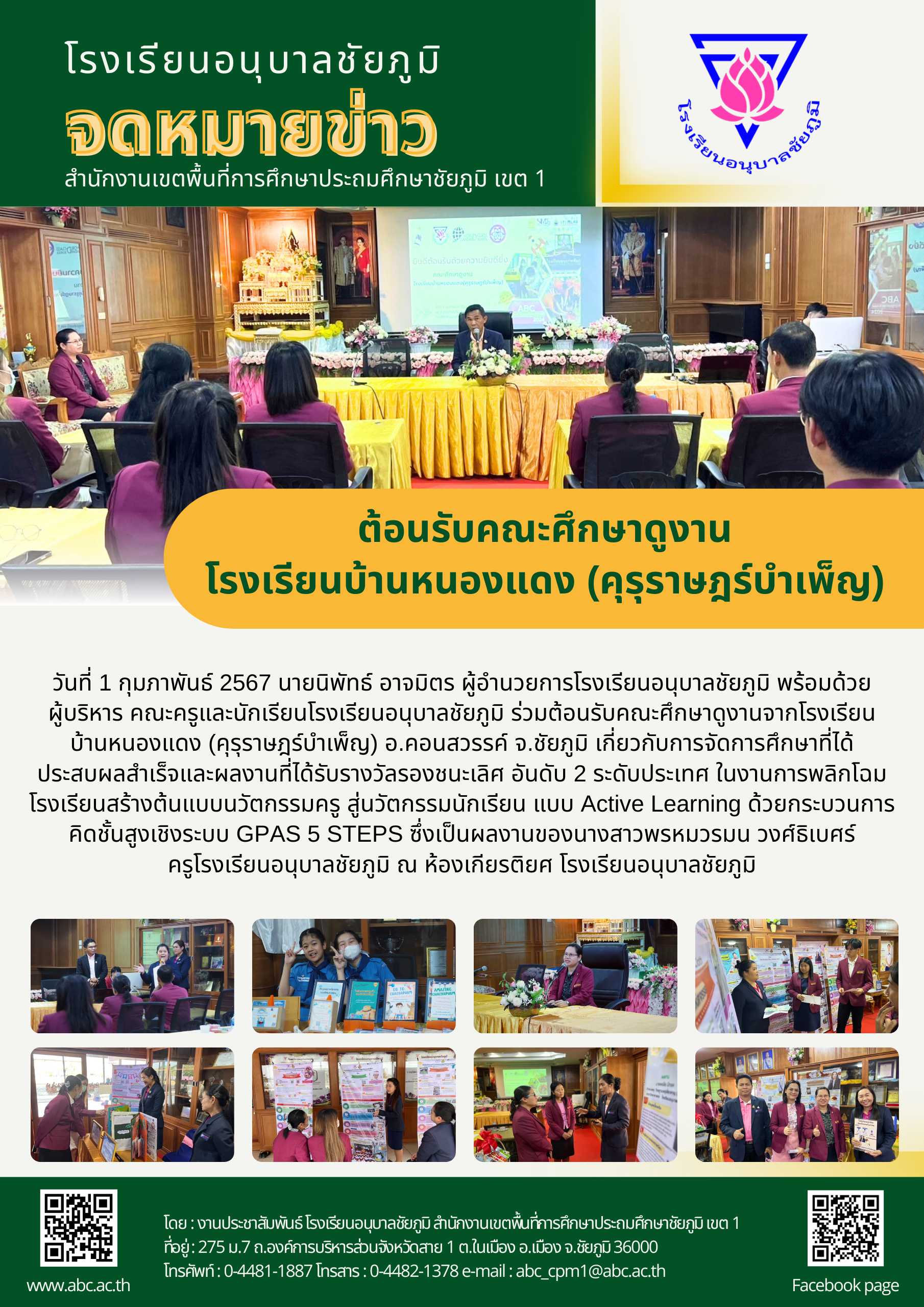 วันที่ 1 กุมภาพันธ์ 2567 นายนิพัทธ์ อาจมิตร ผู้อำนวยการโรงเรียนอนุบาลชัยภูมิ พร้อมด้วยผู้บริหาร คณะครูและนักเรียนโรงเรียนอนุบาลชัยภูมิ ร่วมต้อนรับคณะศึกษาดูงานจากโรงเรียนบ้านหนองแดง (คุรุราษฎร์บำเพ็ญ) อ.คอนสวรรค์ จ.ชัยภูมิ เกี่ยวกับการจัดการศึกษาที่ได้ประสบผลสำเร็จและผลงานที่ได้รับรางวัลรองชนะเลิศ อันดับ 2 ระดับประเทศ ในงานการพลิกโฉมโรงเรียนสร้างต้นแบบนวัตกรรมครู สู่นวัตกรรมนักเรียน แบบ Active Learning ด้วยกระบวนการคิดชั้นสูงเชิงระบบ GPAS 5 STEPS ซึ่งเป็นผลงานของนางสาวพรหมวรมน วงศ์ธิเบศร์ ครูโรงเรียนอนุบาลชัยภูมิ ณ ห้องเกียรติยศ โรงเรียนอนุบาลชัยภูมิ