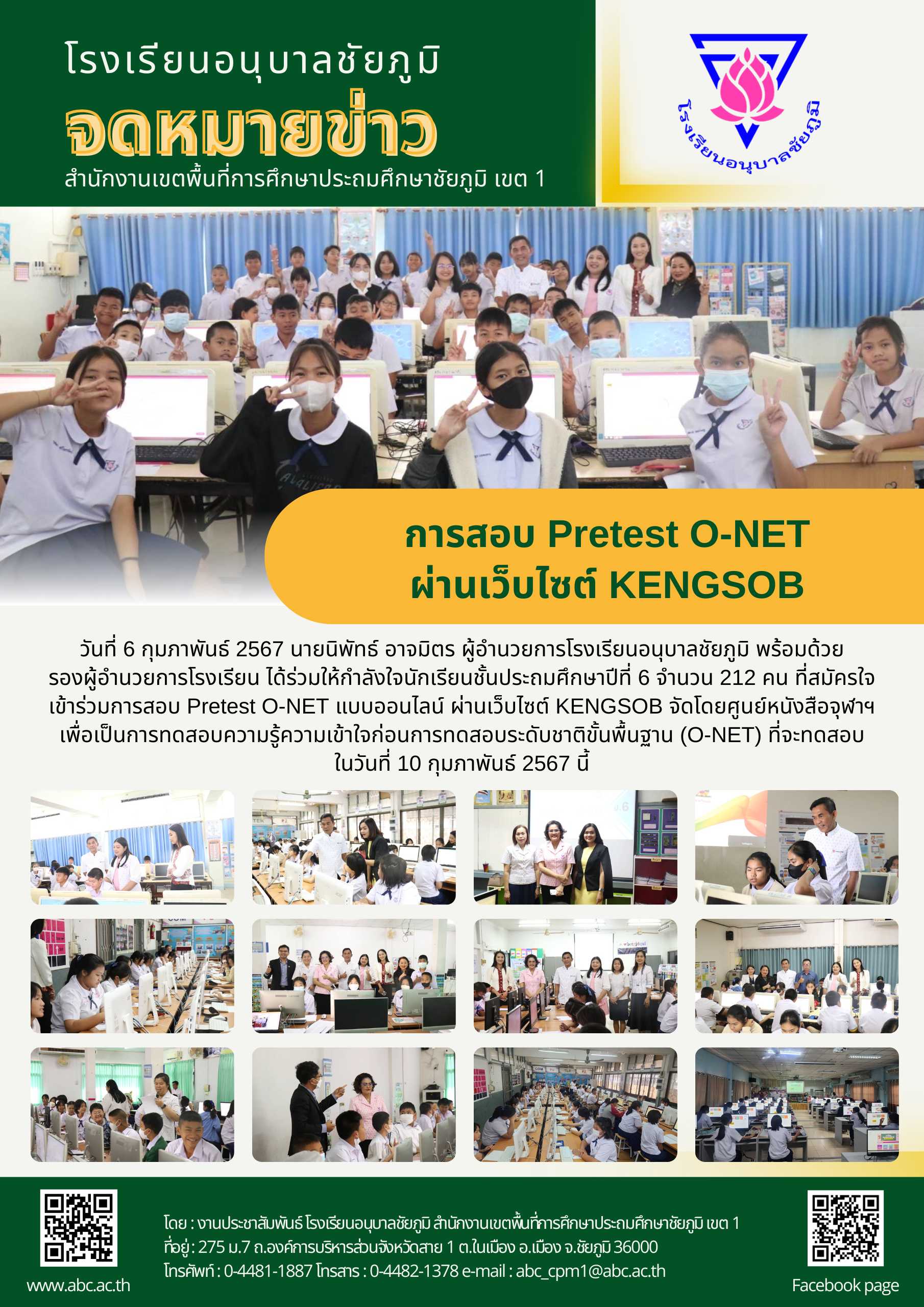 วันที่ 6 กุมภาพันธ์ 2567 นายนิพัทธ์ อาจมิตร ผู้อำนวยการโรงเรียนอนุบาลชัยภูมิ พร้อมด้วยรองผู้อำนวยการโรงเรียน ได้ร่วมให้กำลังใจนักเรียนชั้นประถมศึกษาปีที่ 6 จำนวน 212 คน ที่สมัครใจเข้าร่วมการสอบ Pretest O-NET แบบออนไลน์ ผ่านเว็บไซต์ KENGSOB จัดโดยศูนย์หนังสือจุฬาฯ เพื่อเป็นการทดสอบความรู้ความเข้าใจก่อนการทดสอบระดับชาติขั้นพื้นฐาน (O-NET) ที่จะทดสอบในวันที่ 10 กุมภาพันธ์ 2567 นี้