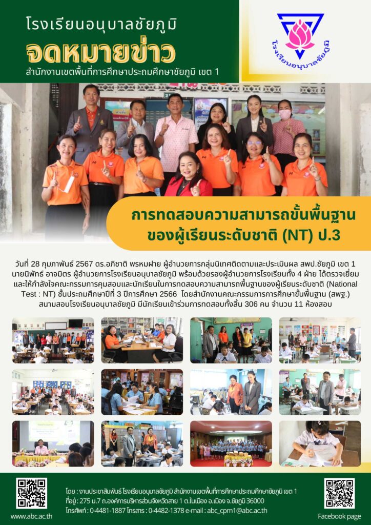 วันที่ 28 กุมภาพันธ์ 2567 ดร.อภิชาติ พรหมฝาย ผู้อำนวยการกลุ่มนิเทศติดตามและประเมินผล สพป.ชัยภูมิ เขต 1 นายนิพัทธ์ อาจมิตร ผู้อำนวยการโรงเรียนอนุบาลชัยภูมิ พร้อมด้วยรองผู้อำนวยการโรงเรียนทั้ง 4 ฝ่าย ได้ตรวจเยี่ยมและให้กำลังใจคณะกรรมการคุมสอบและนักเรียนในการทดสอบความสามารถพื้นฐานของผู้เรียนระดับชาติ (National Test : NT) ชั้นประถมศึกษาปีที่ 3 ปีการศึกษา 2566 โดยสำนักงานคณะกรรมการการศึกษาขั้นพื้นฐาน (สพฐ.) สนามสอบโรงเรียนอนุบาลชัยภูมิ มีนักเรียนเข้าร่วมการทดสอบทั้งสิ้น 306 คน จำนวน 11 ห้องสอบ