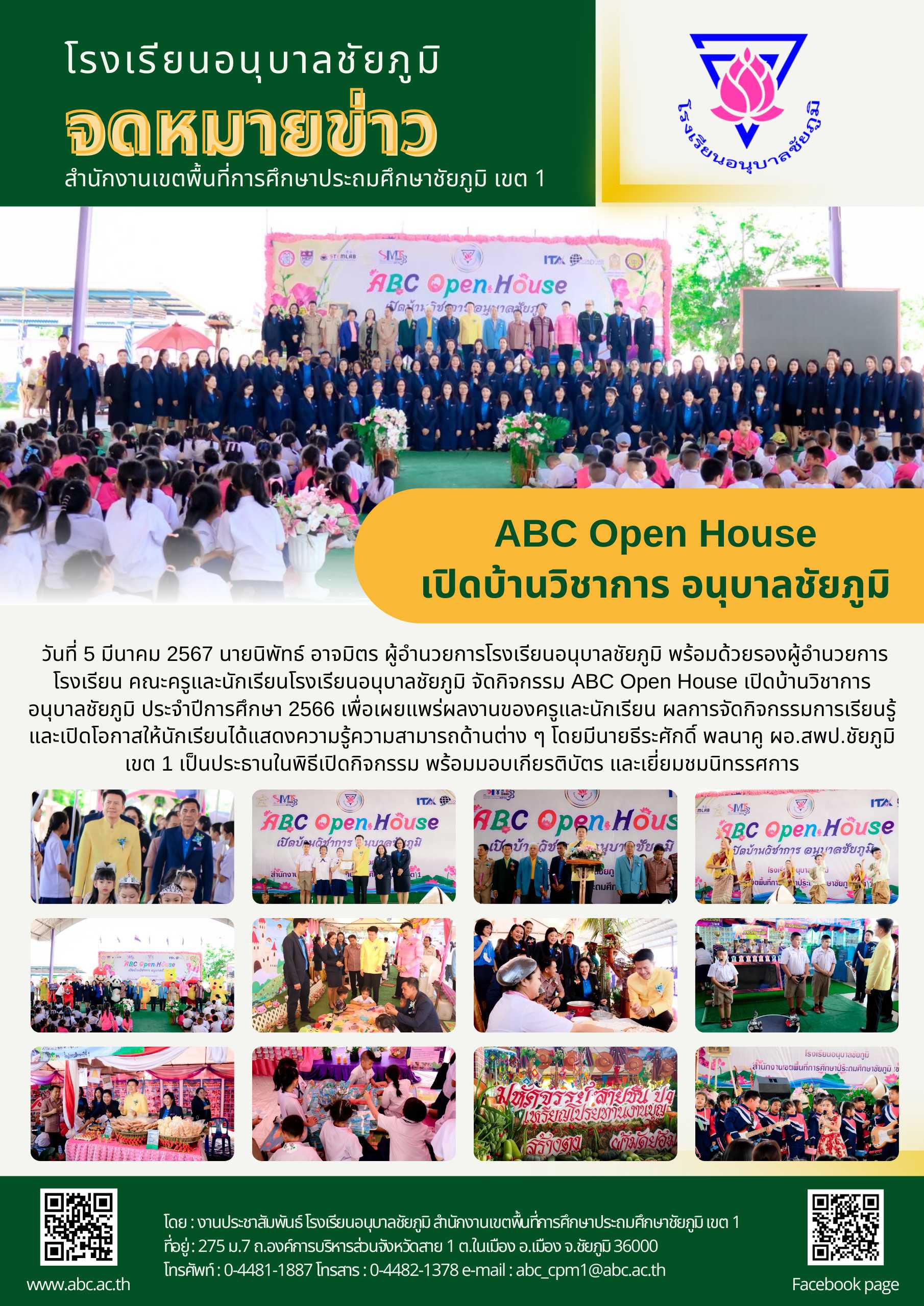 วันที่ 5 มีนาคม 2567 นายนิพัทธ์ อาจมิตร ผู้อำนวยการโรงเรียนอนุบาลชัยภูมิ พร้อมด้วยรองผู้อำนวยการโรงเรียน คณะครูและนักเรียนโรงเรียนอนุบาลชัยภูมิ จัดกิจกรรม ABC Open House เปิดบ้านวิชาการ อนุบาลชัยภูมิ ประจำปีการศึกษา 2566 เพื่อเผยแพร่ผลงานของครูและนักเรียน ผลการจัดกิจกรรมการเรียนรู้ และเปิดโอกาสให้นักเรียนได้แสดงความรู้ความสามารถด้านต่าง ๆ โดยมีนายธีระศักดิ์ พลนาคู ผอ.สพป.ชัยภูมิ เขต 1 เป็นประธานในพิธีเปิดกิจกรรม พร้อมมอบเกียรติบัตร และเยี่ยมชมนิทรรศการ