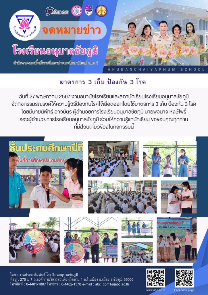 วันที่ 27 พฤษภาคม 2567 งานอนามัยโรงเรียนและสภานักเรียนโรงเรียนอนุบาลชัยภูมิ จัดกิจกรรมรณรงค์ให้ความรู้วิธีป้องกันโรคไข้เลือดออกโดยใช้มาตรการ 3 เก็บ ป้องกัน 3 โรค โดยมีนายนิพัทธ์ อาจมิตร ผู้อำนวยการโรงเรียนอนุบาลชัยภูมิ นายพจนาจ หงษ์โพธิ์ รองผู้อำนวยการโรงเรียนอนุบาลชัยภูมิ ร่วมให้ความรู้แก่นักเรียน ขอขอบคุณทุกท่านที่มีส่วนเกี่ยวข้องในกิจกรรมนี้