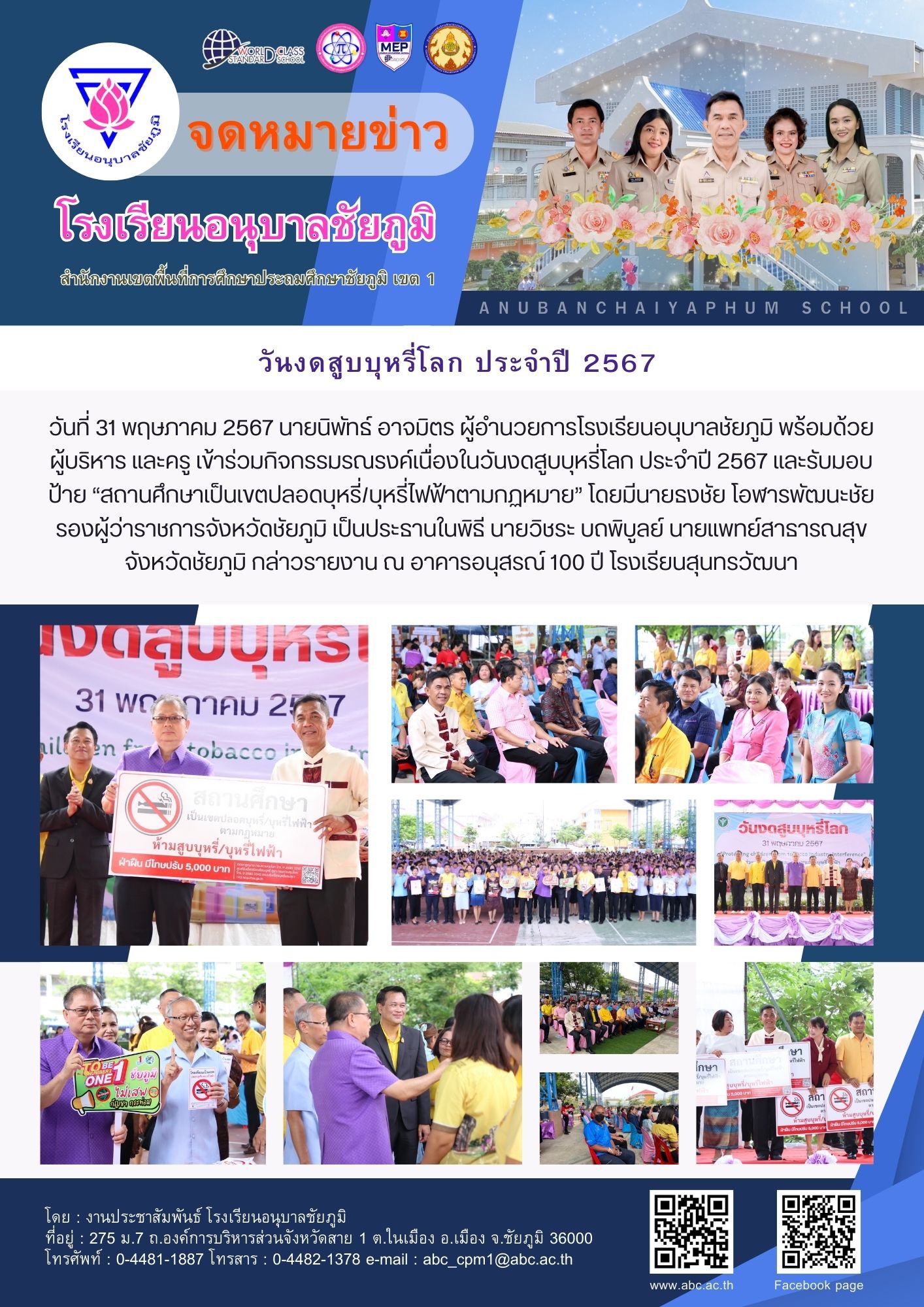 วันที่ 31 พฤษภาคม 2567 นายนิพัทธ์ อาจมิตร ผู้อำนวยการโรงเรียนอนุบาลชัยภูมิ พร้อมด้วยผู้บริหาร และครู เข้าร่วมกิจกรรมรณรงค์เนื่องในวันงดสูบบุหรี่โลก ประจำปี 2567 และรับมอบป้าย “สถานศึกษาเป็นเขตปลอดบุหรี่/บุหรี่ไฟฟ้าตามกฏหมาย” โดยมีนายธงชัย โอฬารพัฒนะชัย รองผู้ว่าราชการจังหวัดชัยภูมิ เป็นประธานในพิธี นายวิชระ บถพิบูลย์ นายแพทย์สาธารณสุขจังหวัดชัยภูมิ กล่าวรายงาน ณ อาคารอนุสรณ์ 100 ปี โรงเรียนสุนทรวัฒนา