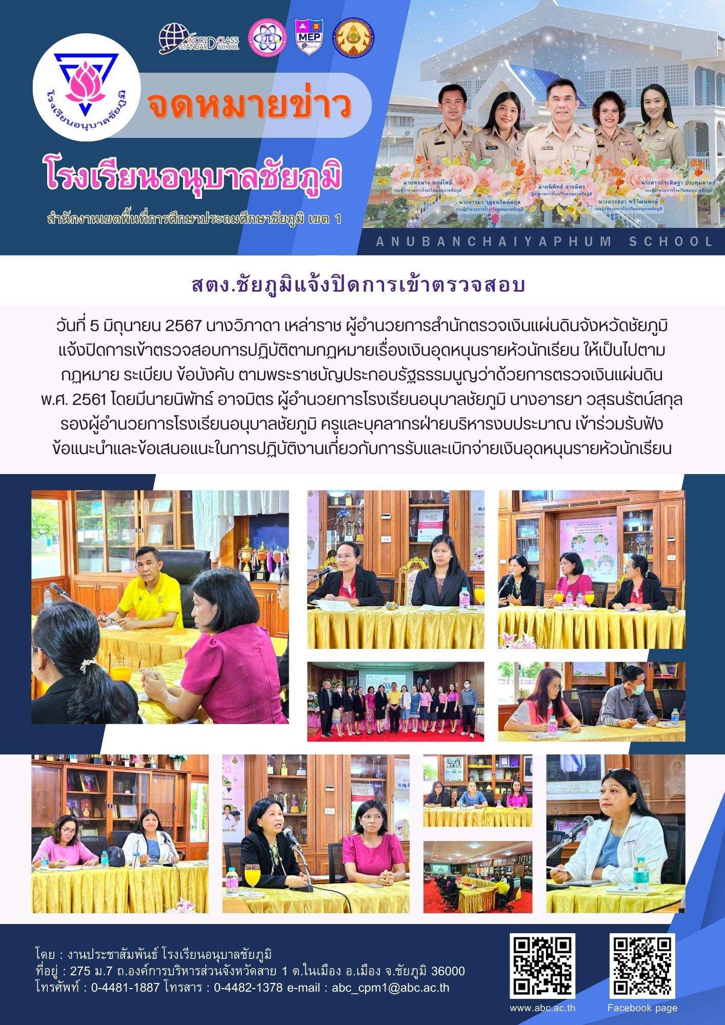 วันที่ 5 มิถุนายน 2567 นางวิภาดา เหล่าราช ผู้อำนวยการสำนักตรวจเงินแผ่นดินจังหวัดชัยภูมิ แจ้งปิดการเข้าตรวจสอบการปฏิบัติตามกฏหมายเรื่องเงินอุดหนุนรายหัวนักเรียน ให้เป็นไปตามกฏหมาย ระเบียบ ข้อบังคับ ตามพระราชบัญประกอบรัฐธรรมนูญว่าด้วยการตรวจเงินแผ่นดินพ.ศ. 2561 โดยมีนายนิพัทธ์ อาจมิตร ผู้อำนวยการโรงเรียนอนุบาลชัยภูมิ นางอารยา วสุธนรัตน์สกุล รองผู้อำนวยการโรงเรียนอนุบาลชัยภูมิ ครูและบุคลากรฝ่ายบริหารงบประมาณ เข้าร่วมรับฟังข้อแนะนำและข้อเสนอแนะในการปฏิบัติงานเกี่ยวกับการรับและเบิกจ่ายเงินอุดหนุนรายหัวนักเรียน