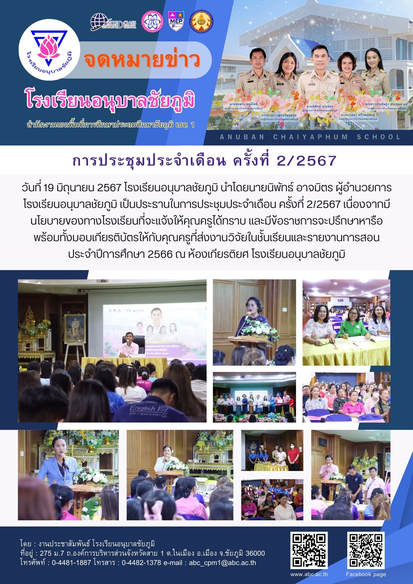 วันที่ 19 มิถุนายน 2567 โรงเรียนอนุบาลชัยภูมิ นำโดยนายนิพัทธ์ อาจมิตร ผู้อำนวยการโรงเรียนอนุบาลชัยภูมิ เป็นประธานในการประชุมประจำเดือน ครั้งที่ 2/2567 เนื่องจากมีนโยบายของทางโรงเรียนที่จะแจ้งให้คุณครูได้ทราบ และมีข้อราชการจะปรึกษาหารือ พร้อมทั้งมอบเกียรติบัตรให้กับคุณครูที่ส่งงานวิจัยในชั้นเรียนและรายงานการสอน ประจำปีการศึกษา 2566 ณ ห้องเกียรติยศ โรงเรียนอนุบาลชัยภูมิ