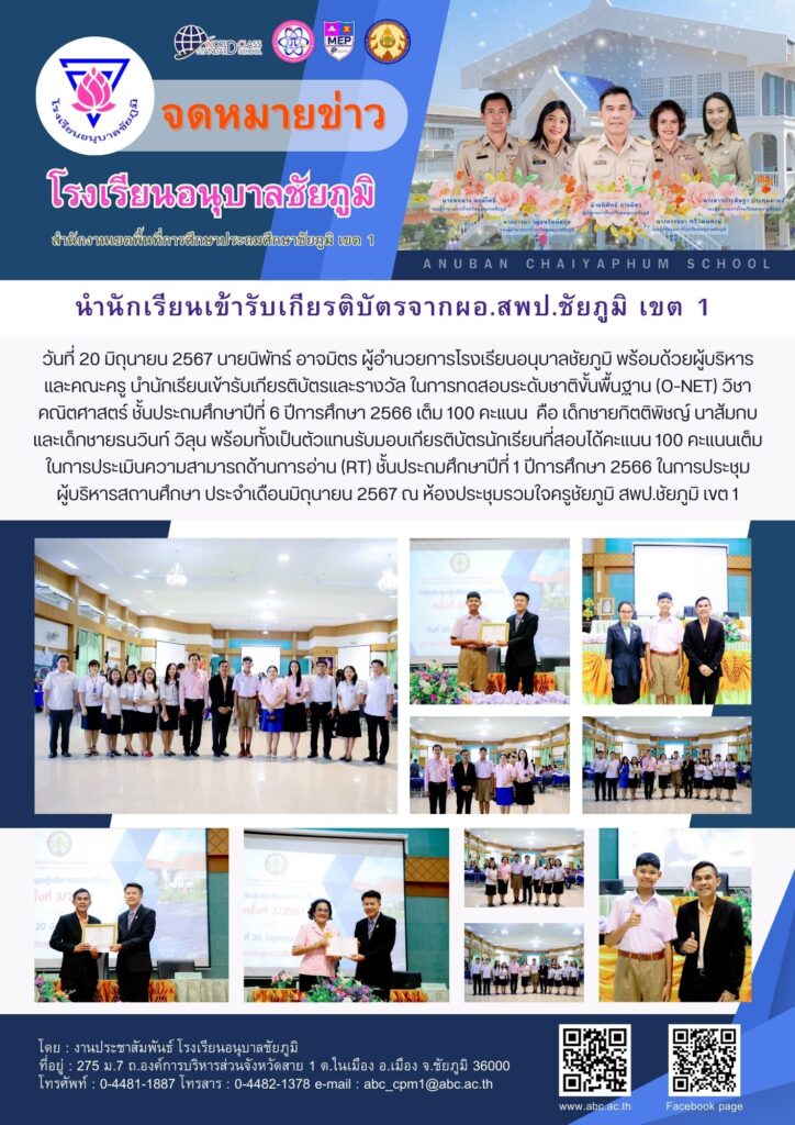 วันที่ 20 มิถุนายน 2567 นายนิพัทธ์ อาจมิตร ผู้อำนวยการโรงเรียนอนุบาลชัยภูมิ พร้อมด้วยผู้บริหารและคณะครู นำนักเรียนเข้ารับเกียรติบัตรและรางวัล ในการทดสอบระดับชาติขั้นพื้นฐาน (O-NET) วิชาคณิตศาสตร์ ชั้นประถมศึกษาปีที่ 6 ปีการศึกษา 2566 เต็ม 100 คะแนน คือ เด็กชายกิตติพิชญ์ นาส้มกบ และเด็กชายธนวินท์ วิลุน พร้อมทั้งเป็นตัวแทนรับมอบเกียรติบัตรนักเรียนที่สอบได้คะแนน 100 คะแนนเต็ม ในการประเมินความสามารถด้านการอ่าน (RT) ชั้นประถมศึกษาปีที่ 1 ปีการศึกษา 2566 ในการประชุมผู้บริหารสถานศึกษา ประจำเดือนมิถุนายน 2567 ณ ห้องประชุมรวมใจครูชัยภูมิ สพป.ชัยภูมิ เขต 1