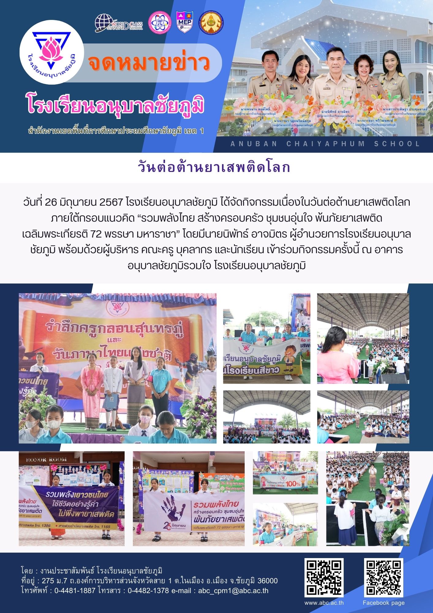 วันที่ 26 มิถุนายน 2567 โรงเรียนอนุบาลชัยภูมิ ได้จัดกิจกรรมเนื่องในวันต่อต้านยาเสพติดโลก ภายใต้กรอบแนวคิด “รวมพลังไทย สร้างครอบครัว ชุมชนอุ่นใจ พ้นภัยยาเสพติด เฉลิมพระเกียรติ 72 พรรษา มหาราชา” โดยมีนายนิพัทธ์ อาจมิตร ผู้อำนวยการโรงเรียนอนุบาลชัยภูมิ พร้อมด้วยผู้บริหาร คณะครู บุคลากร และนักเรียน เข้าร่วมกิจกรรมครั้งนี้ ณ อาคารอนุบาลชัยภูมิรวมใจ โรงเรียนอนุบาลชัยภูมิ