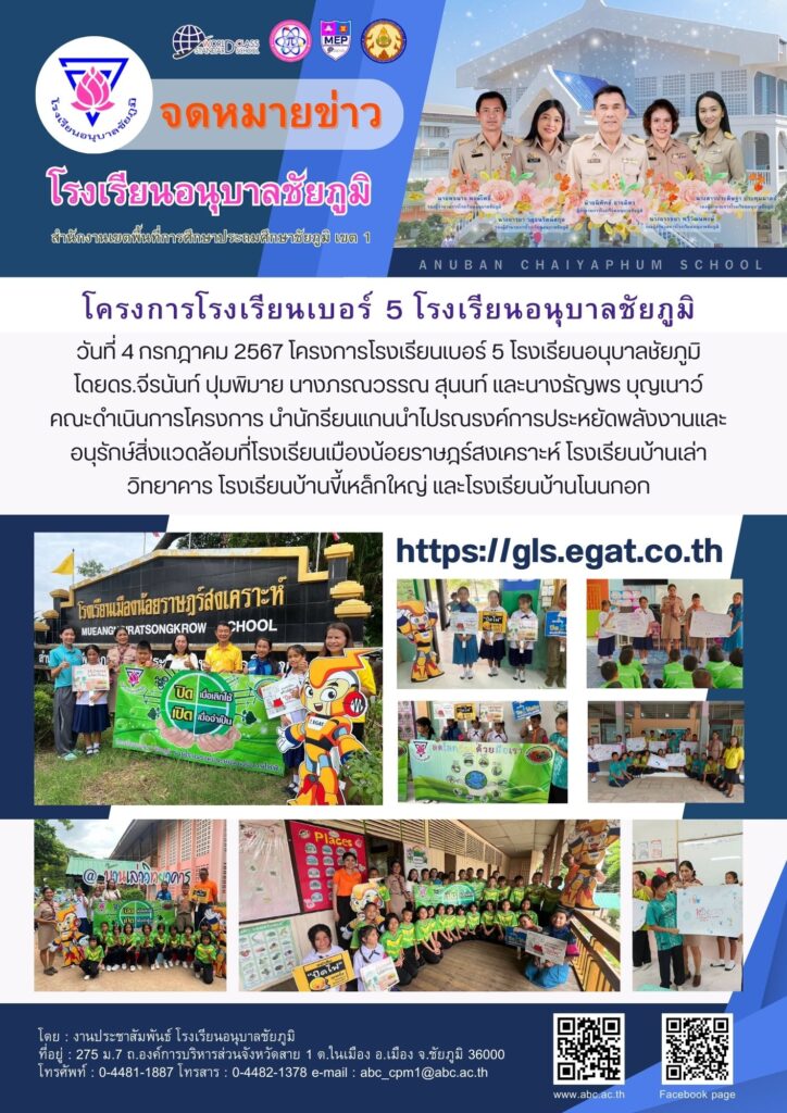 วันที่ 4 กรกฎาคม 2567 โครงการโรงเรียนเบอร์ 5 โรงเรียนอนุบาลชัยภูมิ โดยดร.จีรนันท์ ปุมพิมาย นางภรณวรรณ สุนนท์ และนางธัญพร บุญเนาว์ คณะดำเนินการโครงการ นำนักรียนแกนนำไปรณรงค์การประหยัดพลังงานและอนุรักษ์สิ่งแวดล้อมที่โรงเรียนเมืองน้อยราษฎร์สงเคราะห์ โรงเรียนบ้านเล่าวิทยาคาร โรงเรียนบ้านขี้เหล็กใหญ่ และโรงเรียนบ้านโนนกอก