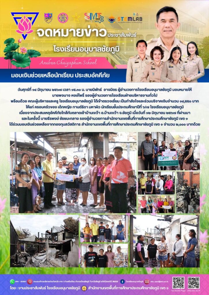 วันศุกร์ที่ ๑๔ มิถุนายน ๒๕๖๗ เวลา ๑๕.๓๐ น. นายนิพัทธ์ อาจมิตร ผู้อำนวยการโรงเรียนอนุบาลชัยภูมิ มอบหมายให้นายพจนาจ หงษ์โพธิ์ รองผู้อำนวยการโรงเรียนฝ่ายบริหารงานทั่วไป พร้อมด้วย คณะผู้บริหารและครูโรงเรียนอนุบาลชัยภูมิ ได้เข้าตรวจเยี่ยม เป็นกำลังใจและร่วมบริจาคเงินจำนวน ๑๔,๕๕๐ บาทให้แก่ ครอบครัวของ เด็กหญิง กานต์ธิดา มหาผิว นักเรียนชั้นประถมศึกษาปีที่ ๖/๗ โรงเรียนอนุบาลชัยภูมิ เนื่องจากประสบเหตุอัคคีภัยใกล้กับตลาดเช้าบ้านเว้า อ.บ้านเขว้า จ.ชัยภูมิ เมื่อวันที่ ๑๒ มิถุนายน ๒๕๖๗ ที่ผ่านมา และในครั้งนี้นายธีรพงษ์ ชัยชนะกลาง รองผู้อำนวยการสำนักงานเขตพื้นที่การศึกษาประถมศึกษาชัยภูมิ เขต ๑ได้ร่วมมอบเงินช่วยเหลือจากกองทุนสวัสดิการ สำนักงานเขตพื้นที่การศึกษาประถมศึกษาชัยภูมิ เขต ๑ จำนวน ๒,๐๐๐ บาทด้วย