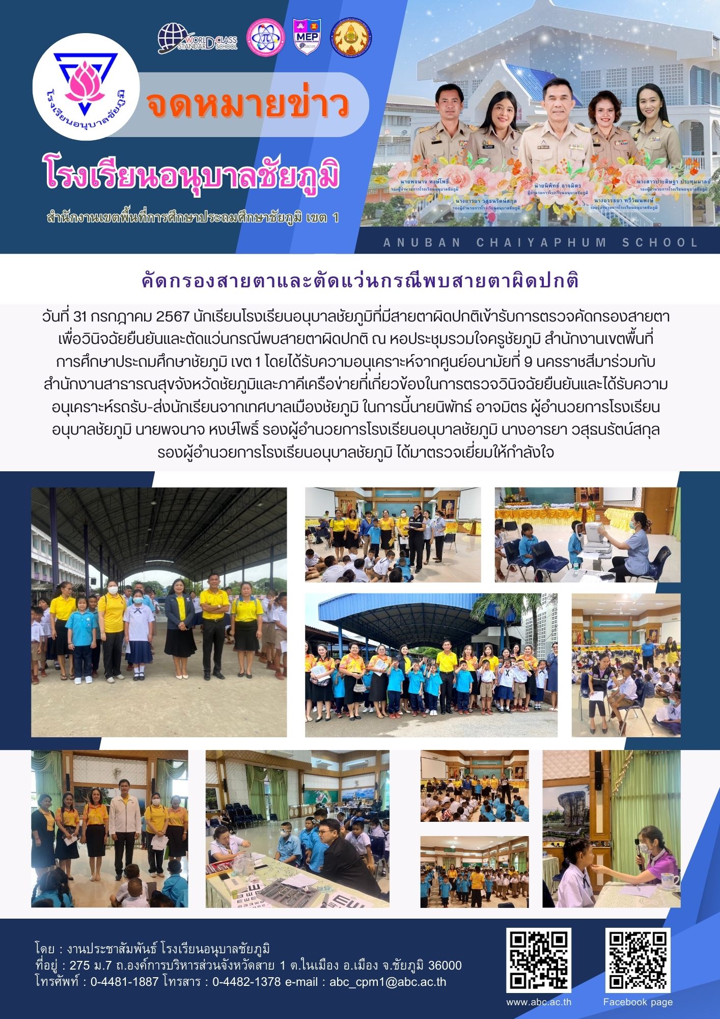 วันที่ 31 กรกฎาคม 2567 นักเรียนโรงเรียนอนุบาลชัยภูมิที่มีสายตาผิดปกติเข้ารับการตรวจคัดกรองสายตา เพื่อวินิจฉัยยืนยันและตัดแว่นกรณีพบสายตาผิดปกติ ณ หอประชุมรวมใจครูชัยภูมิ สำนักงานเขตพื้นที่การศึกษาประถมศึกษาชัยภูมิ เขต 1 โดยได้รับความอนุเคราะห์จากศูนย์อนามัยที่ 9 นครราชสีมาร่วมกับสำนักงานสาธารณสุขจังหวัดชัยภูมิและภาคีเครือข่ายที่เกี่ยวข้องในการตรวจวินิจฉัยยืนยันและได้รับความอนุเคราะห์รถรับ-ส่งนักเรียนจากเทศบาลเมืองชัยภูมิ ในการนี้นายนิพัทธ์ อาจมิตร ผู้อำนวยการโรงเรียนอนุบาลชัยภูมิ นายพจนาจ หงษ์โพธิ์ รองผู้อำนวยการโรงเรียนอนุบาลชัยภูมิ นางอารยา วสุธนรัตน์สกุล รองผู้อำนวยการโรงเรียนอนุบาลชัยภูมิ ได้มาตรวจเยี่ยมให้กำลังใจ