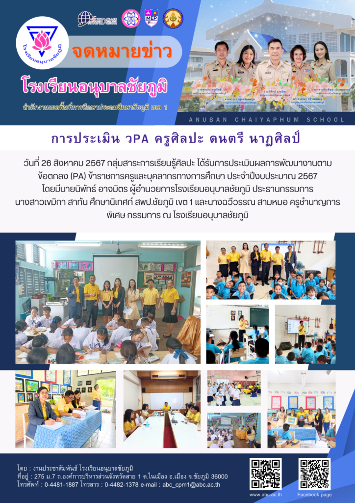วันที่ 26 สิงหาคม 2567 กลุ่มสาระการเรียนรู้ศิลปะ ได้รับการประเมินผลการพัฒนางานตาม ข้อตกลง (PA) ข้าราชการครูและบุคลากรทางการศึกษา ประจำปีงบประมาณ 2567 โดยมีนายนิพัทธ์ อาจมิตร ผู้อำนวยการโรงเรียนอนุบาลชัยภูมิ ประธานกรรมการ นางสาวเขมิกา สาทัน ศึกษานิเทศก์ สพป.ชัยภูมิ เขต 1 และนางฉวีวรรณ สามหมอ ครูชำนาญการพิเศษ กรรมการ ณ โรงเรียนอนุบาลชัยภูมิ