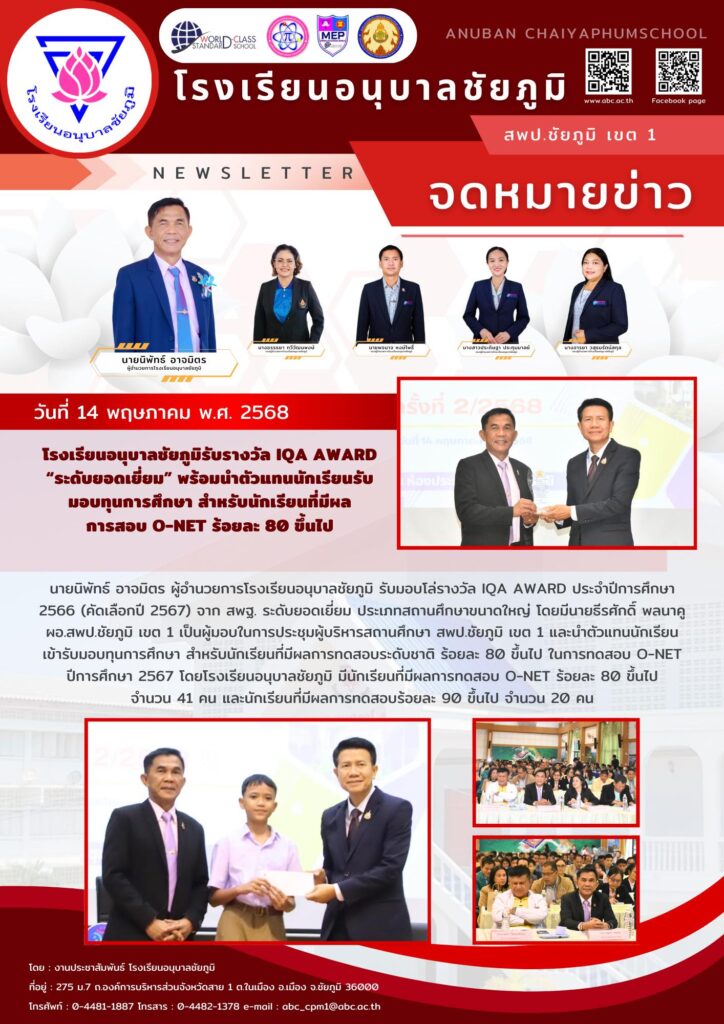 วันที่ 14 พฤษภาคม 2568 นายนิพัทธ์ อาจมิตร ผู้อำนวยการโรงเรียนอนุบาลชัยภูมิ รับมอบโล่รางวัล IQA AWARD ประจำปีการศึกษา 2566 (คัดเลือกปี 2567) จาก สพฐ. ระดับยอดเยี่ยม ประเภทสถานศึกษาขนาดใหญ่ โดยมีนายธีรศักดิ์ พลนาคู ผอ.สพป.ชัยภูมิ เขต 1 เป็นผู้มอบในการประชุมผู้บริหารสถานศึกษา สพป.ชัยภูมิ เขต 1 และนำตัวแทนนักเรียนเข้ารับมอบทุนการศึกษา สำหรับนักเรียนที่มีผลการทดสอบระดับชาติ ร้อยละ 80 ขึ้นไป ในการทดสอบ O-NET ปีการศึกษา 2567 โดยโรงเรียนอนุบาลชัยภูมิ มีนักเรียนที่มีผลการทดสอบ O-NET ร้อยละ 80 ขึ้นไป จำนวน 41 คน และนักเรียนที่มีผลการทดสอบร้อยละ 90 ขึ้นไป จำนวน 20 คน