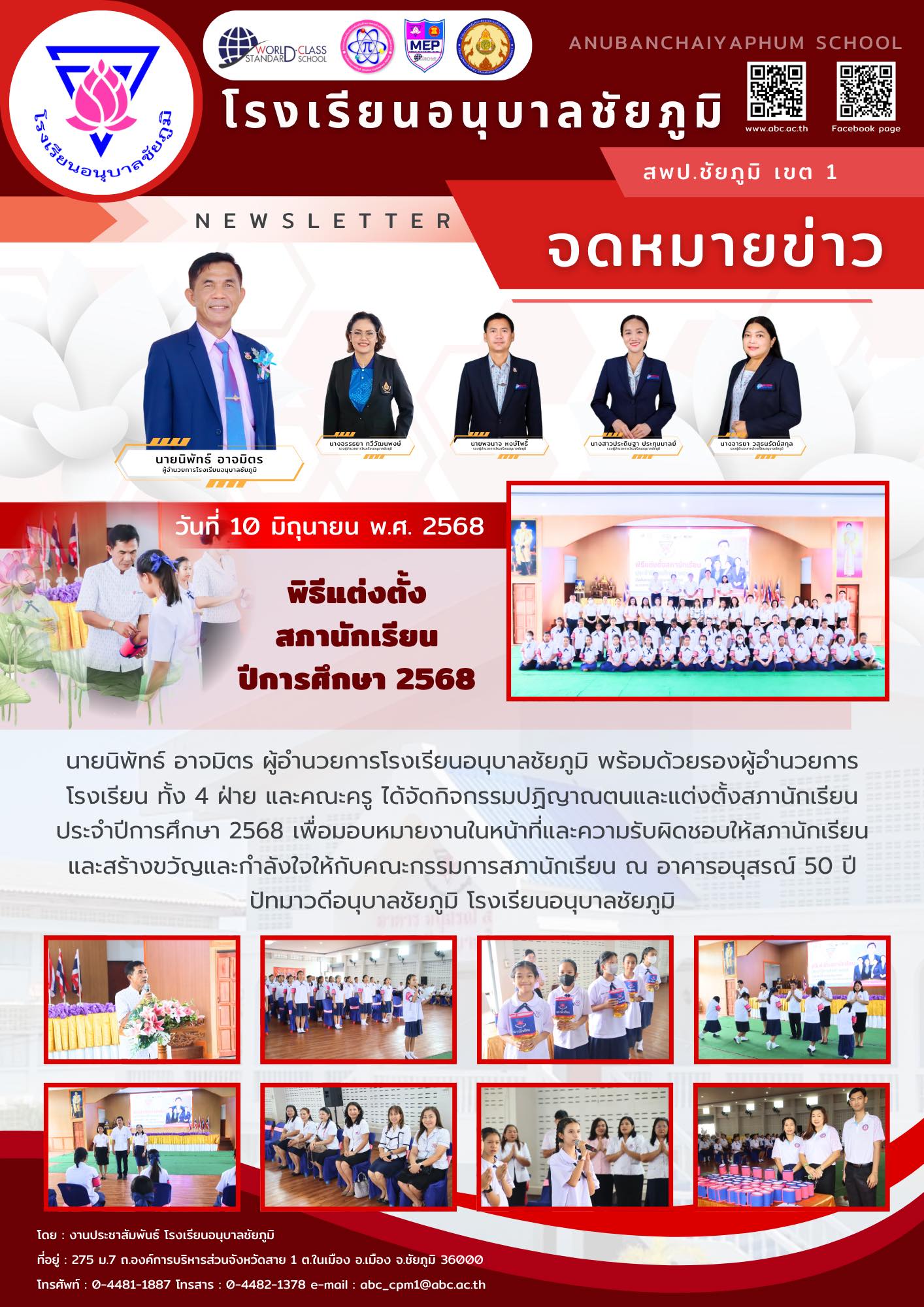 วันที่ 10 มิถุนายน 2568 นายนิพัทธ์ อาจมิตร ผู้อำนวยการโรงเรียนอนุบาลชัยภูมิ พร้อมด้วยรองผู้อำนวยการโรงเรียน ทั้ง 4 ฝ่าย และคณะครู ได้จัดกิจกรรมปฏิญาณตนและแต่งตั้งสภานักเรียน ประจำปีการศึกษา 2568 เพื่อมอบหมายงานในหน้าที่และความรับผิดชอบให้สภานักเรียน และสร้างขวัญและกำลังใจให้กับคณะกรรมการสภานักเรียน ณ อาคารอนุสรณ์ 50 ปี ปัทมาวดีอนุบาลชัยภูมิ โรงเรียนอนุบาลชัยภูมิ