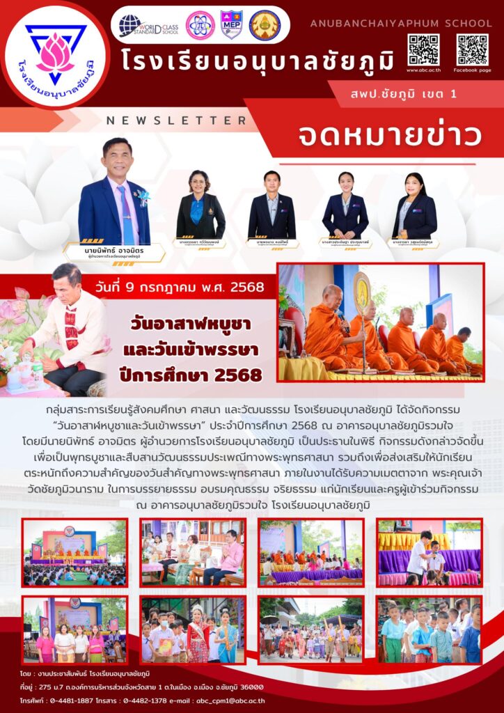 วันที่ 9 กรกฎาคม 2568 กลุ่มสาระการเรียนรู้สังคมศึกษา ศาสนา และวัฒนธรรม โรงเรียนอนุบาลชัยภูมิ ได้จัดกิจกรรม “วันอาสาฬหบูชาและวันเข้าพรรษา” ประจำปีการศึกษา 2568 โดยมีนายนิพัทธ์ อาจมิตร ผู้อำนวยการโรงเรียนอนุบาลชัยภูมิ เป็นประธานในพิธี กิจกรรมดังกล่าวจัดขึ้นเพื่อเป็นพุทธบูชาและสืบสานวัฒนธรรมประเพณีทางพระพุทธศาสนา รวมถึงเพื่อส่งเสริมให้นักเรียนตระหนักถึงความสำคัญของวันสำคัญทางพระพุทธศาสนา ภายในงานได้รับความเมตตาจาก พระคุณเจ้าวัดชัยภูมิวนาราม ในการบรรยายธรรม อบรมคุณธรรม จริยธรรม แก่นักเรียนและครูผู้เข้าร่วมกิจกรรม ณ อาคารอนุบาลชัยภูมิรวมใจ โรงเรียนอนุบาลชัยภูมิ