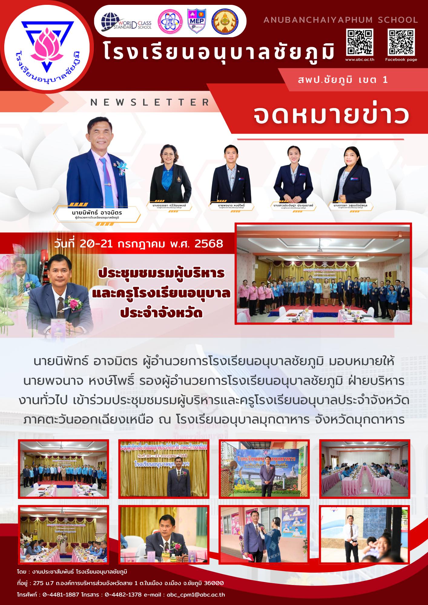 วันที่ 20-21 กรกฎาคม 2568 นายนิพัทธ์ อาจมิตร ผู้อำนวยการโรงเรียนอนุบาลชัยภูมิ มอบหมายให้นายพจนาจ หงษ์โพธิ์ รองผู้อำนวยการโรงเรียนอนุบาลชัยภูมิ ฝ่ายบริหารงานทั่วไป เข้าร่วมประชุมชมรมผู้บริหารและครูโรงเรียนอนุบาลประจำจังหวัดภาคตะวันออกเฉียงเหนือ ณ โรงเรียนอนุบาลมุกดาหาร จังหวัดมุกดาหาร