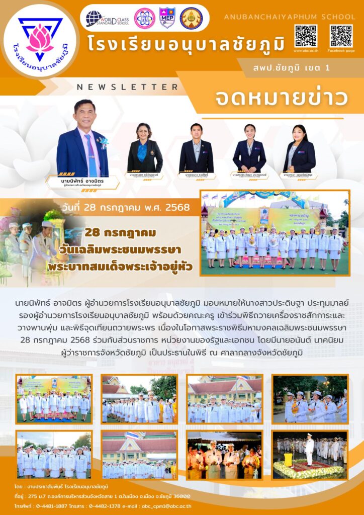 วันที่ 28 กรกฎาคม 2568 นายนิพัทธ์ อาจมิตร ผู้อำนวยการโรงเรียนอนุบาลชัยภูมิ มอบหมายให้นางสาวประดิษฐา ประทุมมาลย์ รองผู้อำนวยการโรงเรียนอนุบาลชัยภูมิ พร้อมด้วยคณะครู เข้าร่วมพิธีถวายเครื่องราชสักการะและวางพานพุ่ม และพิธีจุดเทียนถวายพระพร เนื่องในโอกาสพระราชพิธีมหามงคลเฉลิมพระชนมพรรษา 28 กรกฎาคม 2568 ร่วมกับส่วนราชการ หน่วยงานของรัฐและเอกชน โดยมีนายอนันต์ นาคนิยม ผู้ว่าราชการจังหวัดชัยภูมิ เป็นประธานในพิธี ณ ศาลากลางจังหวัดชัยภูมิ