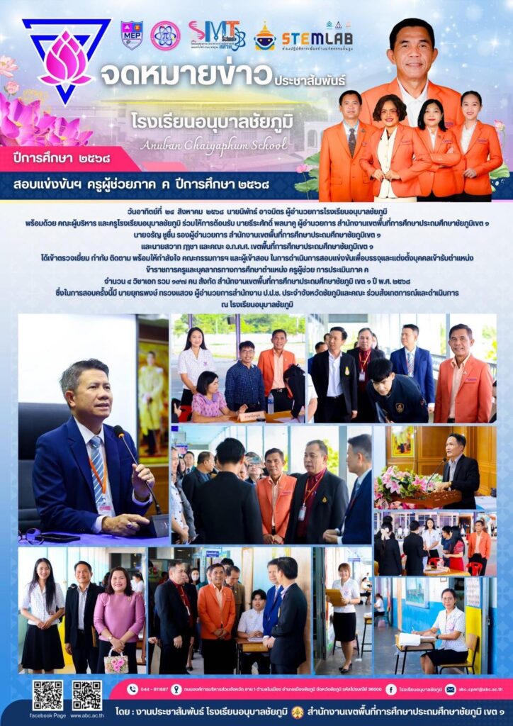 วันอาทิตย์ที่ ๒๔ สิงหาคม ๒๕๖๘ นายนิพัทธ์ อาจมิตร ผู้อำนวยการโรงเรียนอนุบาลชัยภูมิ พร้อมด้วย คณะผู้บริหาร และครูโรงเรียนอนุบาลชัยภูมิ ร่วมให้การต้อนรับ นายธีระศักดิ์ พลนาคู ผู้อำนวยการสำนักงานเขตพื้นที่การศึกษาประถมศึกษาชัยภูมิ เขต ๑ นายจรัญ ชูชื่น รองผู้อำนวยการสำนักงานเขตพื้นที่การศึกษาประถมศึกษาชัยภูมิ เขต ๑ และนายสวาท ฦๅชา และคณะ อ.ก.ค.ศ. เขตพื้นที่การศึกษาประถมศึกษาชัยภูมิ เขต ๑ ได้เข้าตรวจเยี่ยม กำกับ ติดตาม พร้อมให้กำลังใจ คณะกรรมการฯ และผู้เข้าสอบ ในการดำเนินการสอบแข่งขันเพื่อบรรจุและแต่งตั้งบุคคลเข้ารับตำแหน่ง ข้าราชการครูและบุคลากรทางการศึกษาตำแหน่ง ครูผู้ช่วย การประเมินภาค ค จำนวน ๔ วิชาเอก รวม ๑๙๗ คน สังกัด สำนักงานเขตพื้นที่การศึกษาประถมศึกษาชัยภูมิ เขต ๑ ปี พ.ศ. ๒๕๖๘ ซึ่งในการสอบครั้งนี้มี นายยุทธพงษ์ ทรวงแสวง ผู้อำนวยการสำนักงาน ป.ป.ช. ประจำจังหวัดชัยภูมิและคณะ ร่วมสังเกตการณ์และดำเนินการ ณ โรงเรียนอนุบาลชัยภูมิ