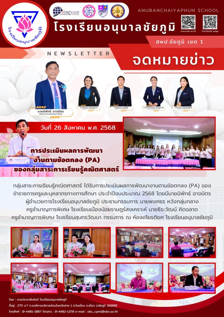 วันที่ 26 สิงหาคม 2568 กลุ่มสาระการเรียนรู้คณิตศาสตร์ ได้รับการประเมินผลการพัฒนางานตามข้อตกลง (PA) ของข้าราชการครูและบุคลากรทางการศึกษา ประจำปีงบประมาณ 2568 โดยมีนายนิพัทธ์ อาจมิตร ผู้อำนวยการโรงเรียนอนุบาลชัยภูมิ ประธานกรรมการ นายพงศธร หวังกลุ่มกลาง ครูชำนาญการพิเศษ โรงเรียนเมืองน้อยราษฎร์สงเคราะห์ นายธีระวัฒน์ คิดฉลาด ครูชำนาญการพิเศษ โรงเรียนสุนทรวัฒนา กรรมการ ณ ห้องเกียรติยศ โรงเรียนอนุบาลชัยภูมิ